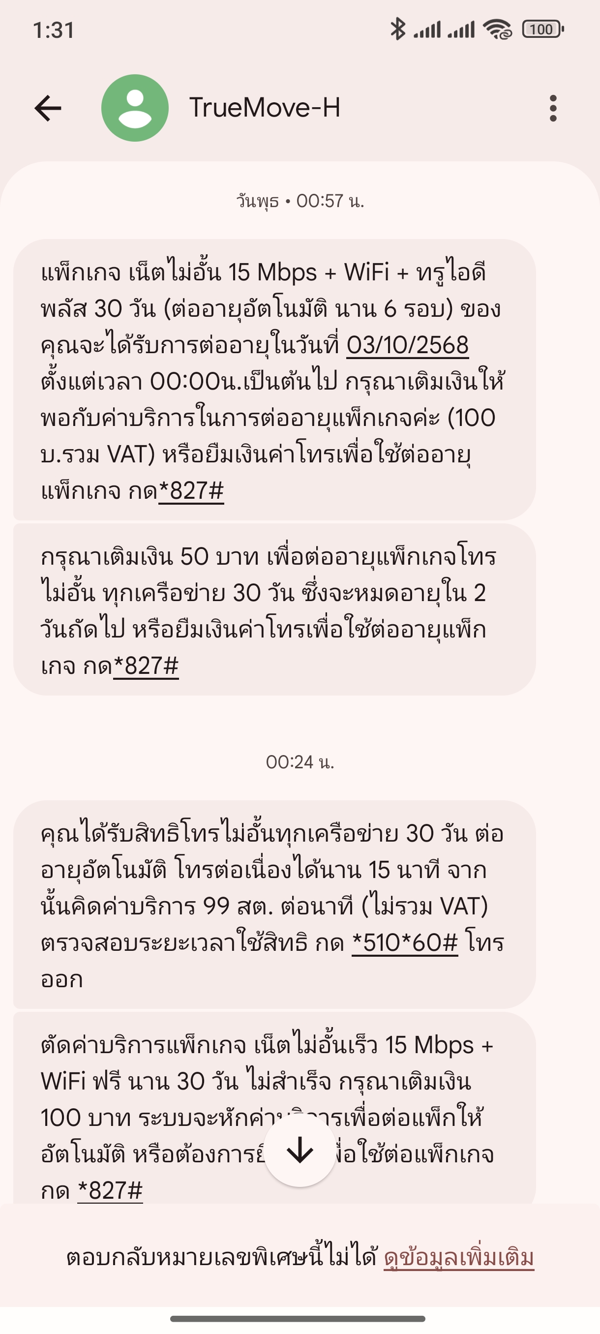 เวลา 00.24 ส่งข้อความนี้มาให้ผม ผมก็เติมเงินเข้าไป แต่ปัญหาเกิดที่ตรงนี้ ไม่ยอมต่อแพ็คเกจให้ผม ผมก็รอซักพักไม่มีการตัด ซัก2ชั่วโมงผมโทรหาคอลเซ็นเตอร์ รับเรื่องแจ้งไปว่าจะติดต่อกลับภายใน24ชั่วโมง ผมก็โอเคแต่ในใจก็ไม่คิดว่าจะนานขนาดนั้น ก็นอนตื่นเช้ามา แพ็คเกจก็ยังไม่ยอมต่อให้ เลยโทรไปอีกรอบ คราวนี้พนักงานแจ้งโปรนี้หมดอายุ ให้ผมเอาโปรใหม่ ความเร็วเหมือนเดิม แต่ราคาเพิ่มจาก100เป็น500 ผมไม่ยอม เพราะข้อความที่ทางทรูส่งมาให้ผมคือเติม100เพื่อต่อแพ้คเกจที่ผมใช้อยู่ประจำ ผมเลยแจ้งไปผมต้องการโปรราคาเดิม พนักงานก็แจ้งว่าภายใน24ชม.จะติดต่อกลับ ผ่านมา2-3วัน ผมยังไม่ได้รับการติดต่อใดๆ โทรไปถามเป็นระยะๆ ก็บอกให้รอ ผมควรทำไงต่อไปดีครับ ไหนโฆษณาควบรวมเพื่อสิ่งทีดีกว่านี้คืออะไรครับทรูมูฟ