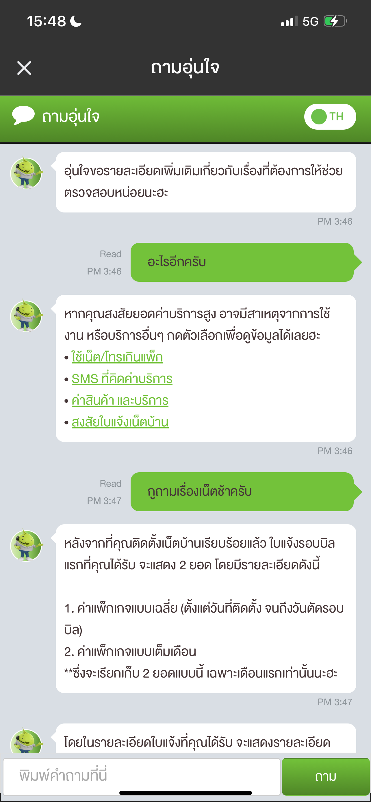AIS บริการแบบให้บอทคุย ชาตินี้จะรู้เรื่องมั้ย ถามซ้ำๆวนๆถามเรื่องเน็ตช้า มาตอบอีกเรื่อง จ่ายก็ราคาเเพงกว่าคนอื่น โปรเน็ตเหมือนกันแท้ รอทรูทำโปรรอย้าย