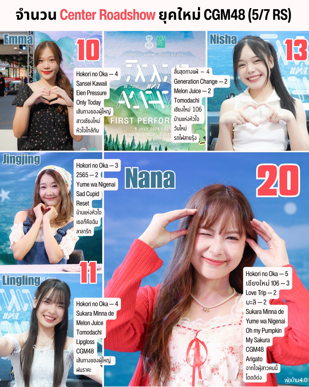 สรุปจำนวนเมมที่ยืน Center ใน Roadshow เนินเขา - ยุคใหม่ของ CGM48 (5/7 RS)