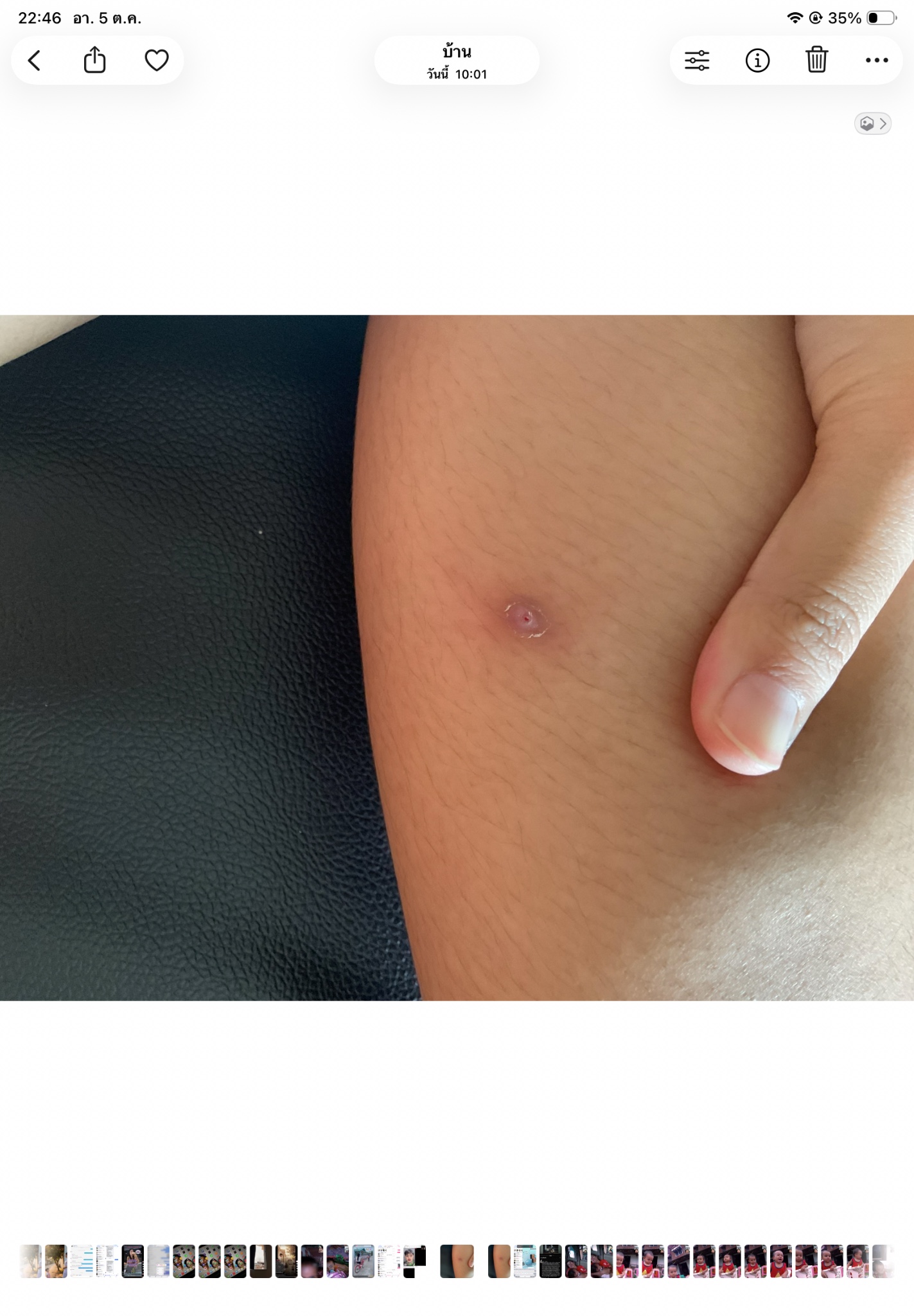 ตอนแรกที่ขาเราขึ้นเป็นคล้ายๆสิวค่ะ เราเลยบีบหลังบีบไป1คืนขาได้บวมขึ้นแดงเป็นตุ่มหนอง แล้วเจ็บค่ะตอนเดิน ผ่านไป1อาทิตย์ ตุ่มหนองแดงค่ะ หลังนั้นแผลแห้งค่ะ แต่มันเป็นรอยสีดำ พอไปจับยังรู้สึกเป็นก้อนแข็งๆ