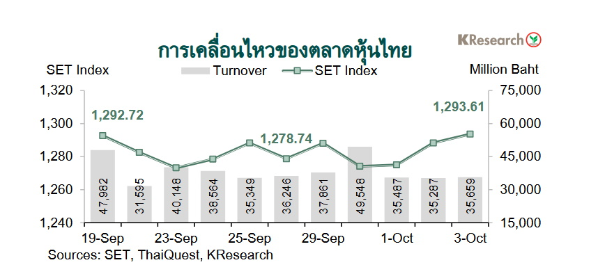 SET Index พลิกกลับมาเคลื่อนไหวในกรอบแคบช่วงกลางสัปดาห์ ระหว่างรอติดตามประเด็นที่รัฐบาลสหรัฐฯ เข้าสู่ภาวะชัตดาวน์ ก่อนจะดีดตัวขึ้นอีกครั้งในช่วงที่เหลือของสัปดาห์ตามทิศทางตลาดหุ้นภูมิภาคจากแนวโน้มการปรับลดดอกเบี้ยนโยบายของเฟด หลังตัวเลขการจ้างงานภาคเอกชนเดือนก.ย. ของสหรัฐฯ ออกมาต่ำกว่าที่คาด