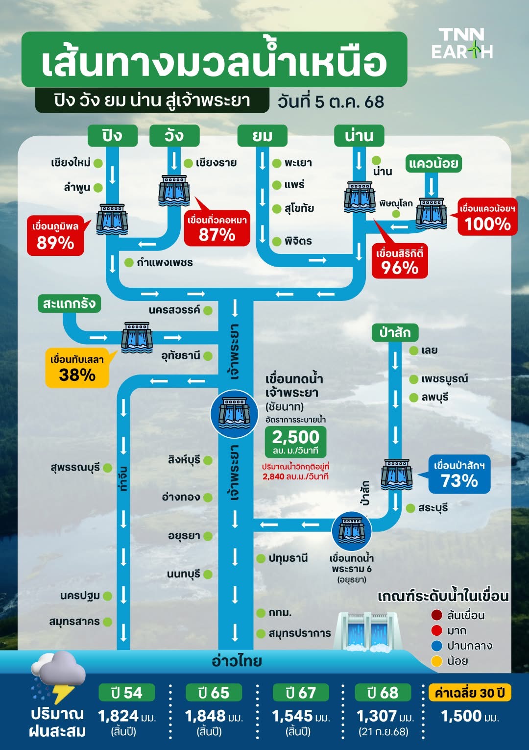 เขื่อนเจ้าพระยา (ชัยนาท) ซึ่งเป็นจุดควบคุมการไหลหลักของน้ำภาคเหนือ ปัจจุบันมีอัตราการระบายน้ำสูงถึง 2,500 ลูกบาศก์เมตรต่อวินาที ซึ่งถือว่าอยู่ในระดับมาก โดยปริมาณน้ำวิกฤติของเขื่อนเจ้าพระยาอยู่ที่ประมาณ 2,840 ลบ.ม./วินาที หากฝนตกซ้ำในช่วงกลางเดือนตุลาคมนี้ อาจทำให้ระดับน้ำในแม่น้ำเจ้าพระยาและลำน้ำสาขาเพิ่มขึ้นอีก ส่งผลให้พื้นที่ลุ่มต่ำในจังหวัด อุทัยธานี ชัยนาท สิงห์บุรี อ่างทอง พระนครศรีอยุธยา และปทุมธานี มีความเสี่ยงต่อภาวะน้ำล้นตลิ่ง