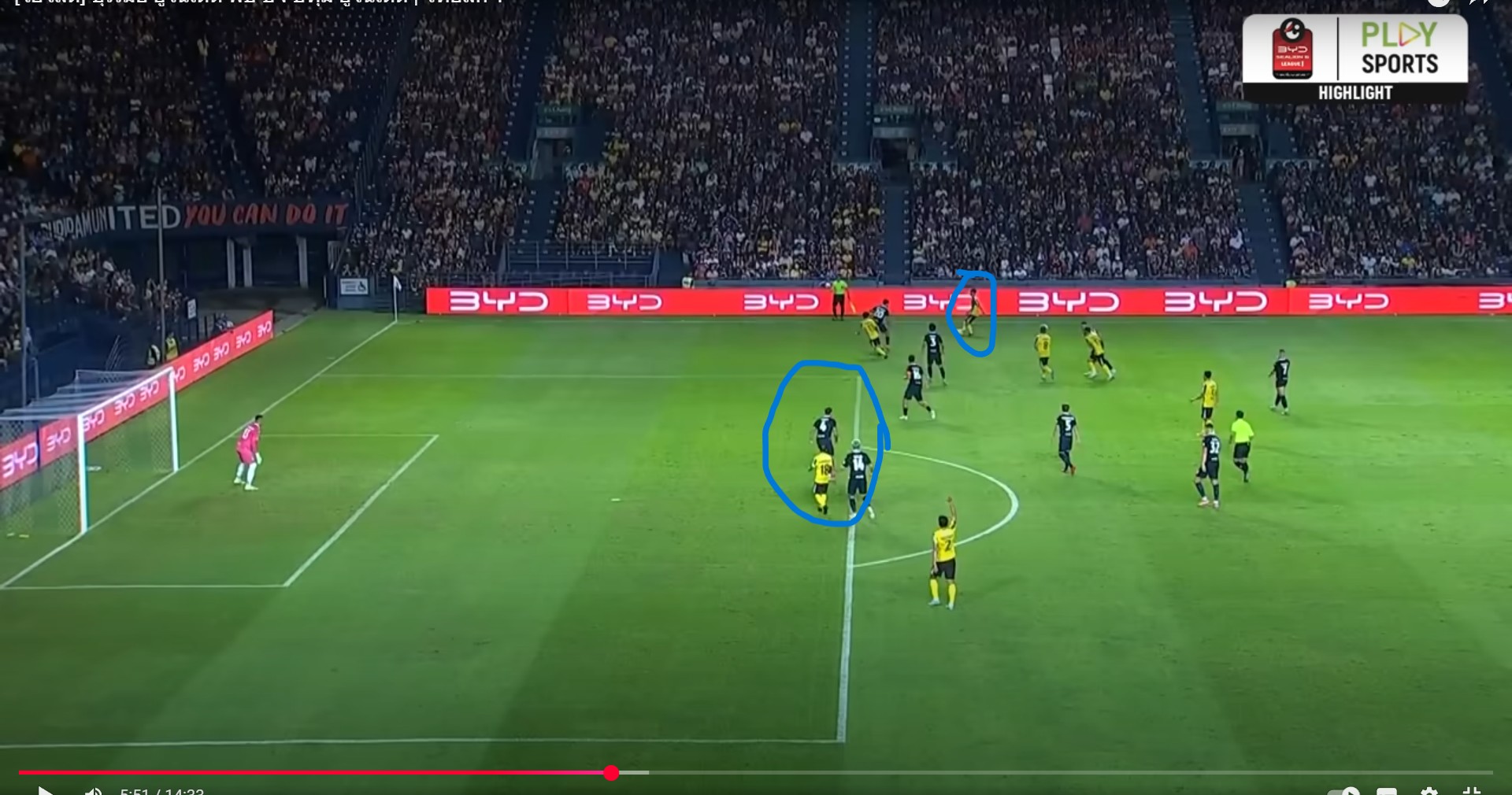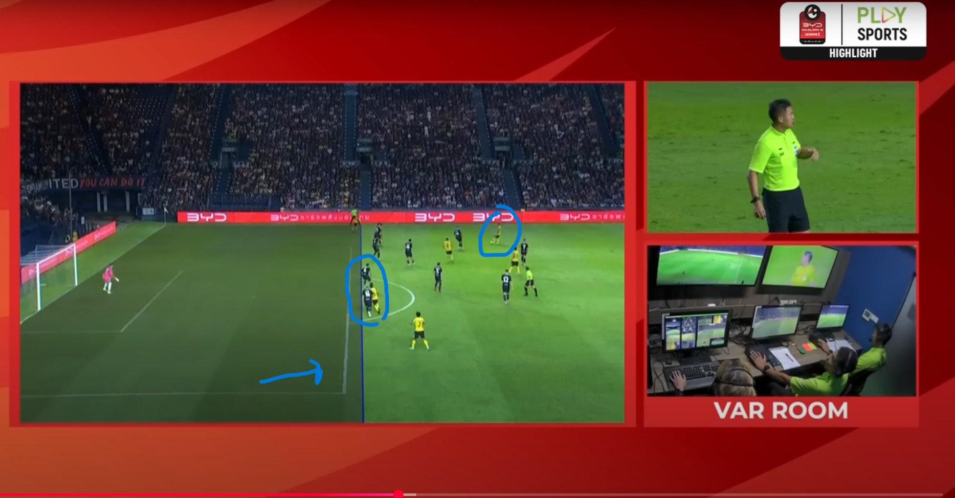 ส่วนจังหวะตีเส้น คนจ่ายบอลกับคนรับบอลก็อยู่คนละตำแหน่ง เจอยู่นอกกรอบนะครับ