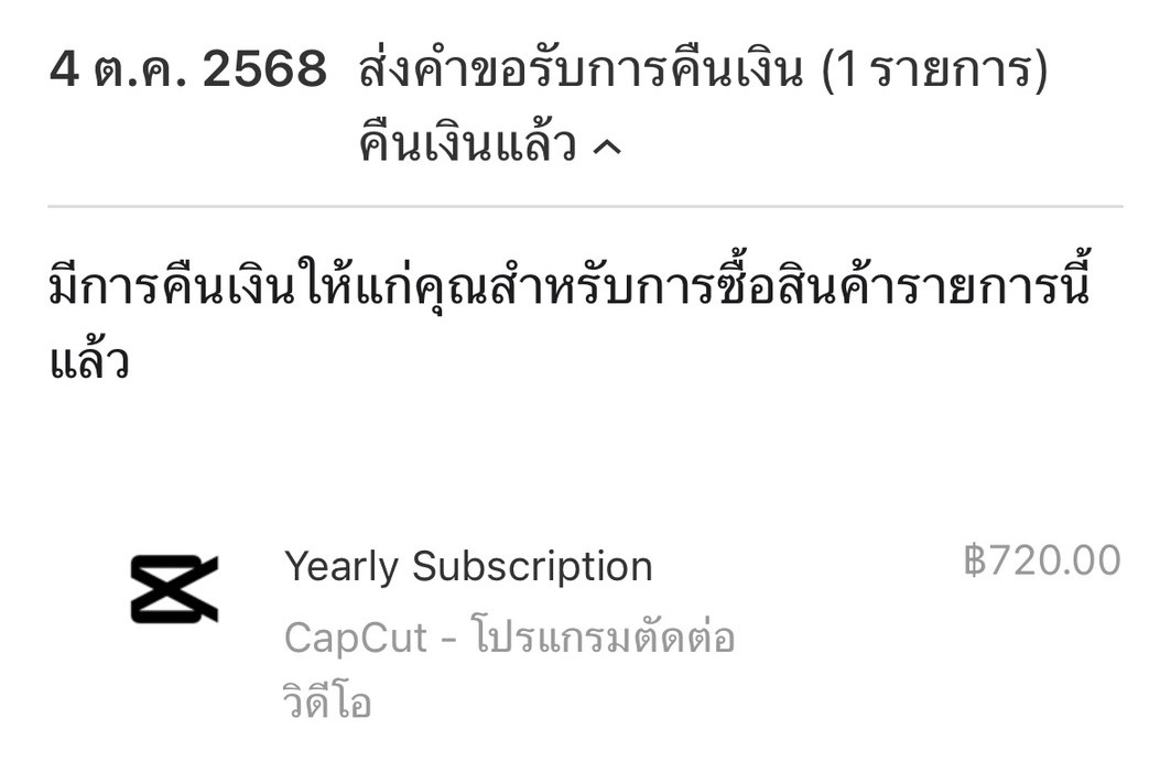 เมื่อวันที่23 กันยายน 2568 กดสมัครcapcut pro ผิดจํานวน150บาท และ apple music จำนวน139บาทต่ออายุอัตโนมัติทั้งที่ไม่ได้อยากต่ออายุ ได้ทำการยกเลิกทั้งคู่และขอเงินคืนทางapple ไปแล้ว และสถานะทํารายการก็ขึ้