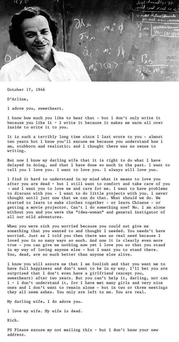 Arline ภรรยาของ Feynman เสียชีวิตตั้งแต่ปี 1945 ด้วยวัณโรค ทั้งสองแต่งงานกันทั้งที่รู้ว่าเธอจะอยู่ได้ไม่นาน ระหว่างที่เธอป่วยเขาก็ดูแลเธอตลอด พอเธอตายไป เขากลายเป็นคนที่มีชื่อเสียงในวงการฟิสิกส์ แต่ในชีวิตส่วนตัวก็ยังโหยหาเธออยู่