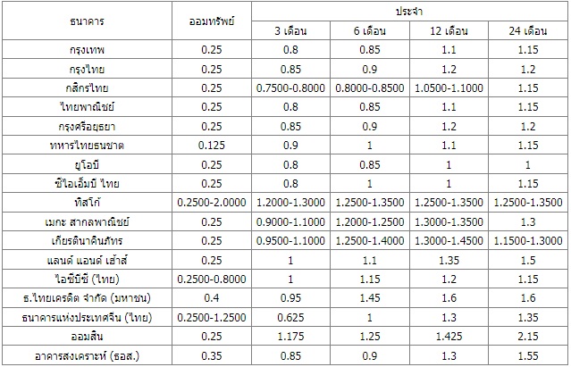 ยูโอบี และ ไอเอ็มบี ไทย อยู่ที่ 1.40% และผู้ที่ให้ผลตอบแทนสูงสุดในกลุ่มนี้คือ แลนด์ แอนด์ เฮ้าส์ และ ธนาคารไทยเครดิต จำกัด (มหาชน) ซึ่งให้เท่ากันที่ 1.60%