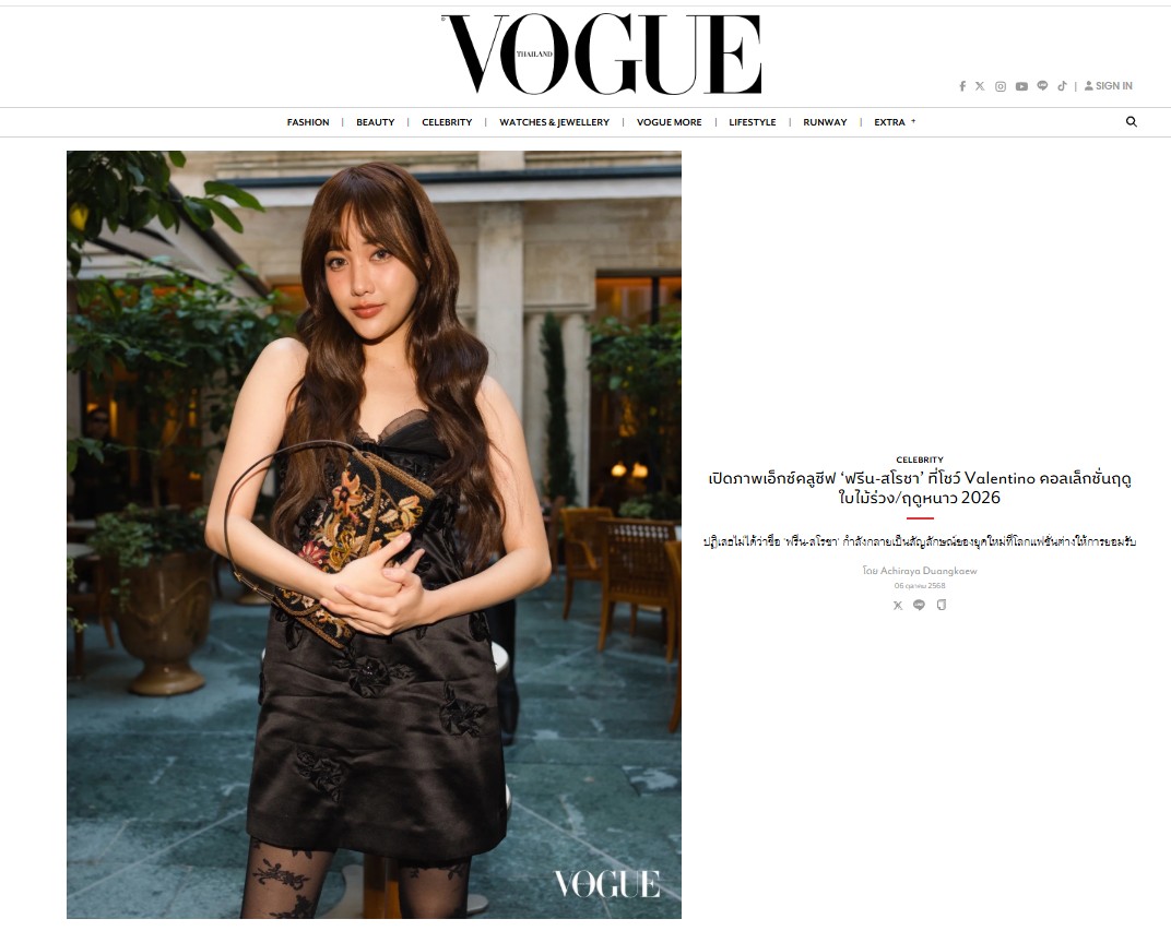 โว้กประเทศไทยเผยภาพเอ็กซ์คลูซีฟของ ‘ฟรีน-สโรชา’ แบรนด์แอมบาสเดอร์ของ Valentino ที่ร่วมชมโชว์คอลเล็กชั่นฤดูใบไม้ร่วง/ฤดูหนาว ประจำปี 2026 ‘Valentino Fireflies’ ภายใต้การนำของ Alessandro Michele ครั้งนี้ถือเป็นการปรากฏตัวครั้งที่สามของเธอที่ปารีสแฟชั่นวีก แต่ก็ยังคงสร้างปรากฏการณ์อย่างถล่มทลาย ด้วยเสน่ห์ที่ผสมผสานความเป็น Valentino เข้ากับเอกลักษณ์ได้อย่างลงตัว จนกลายเป็นอีกหนึ่งไฮไลต์ที่สื่อแฟชั่นต่างให้ความสนใจและมีการพูดถึงอย่างต่อเนื่อง