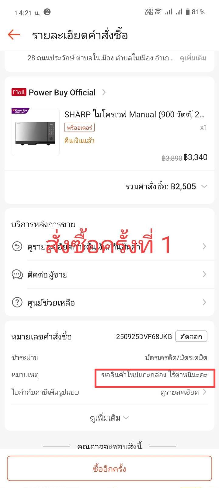 ดิฉันได้สั่งซื้อไมโครเวฟจาก Power Buy และได้แจ้งในใบคำสั่งซื้อเฉพาะว่า 'ต้องการสินค้าใหม่ ไร้ตำหนิ' แต่ปรากฏว่า: