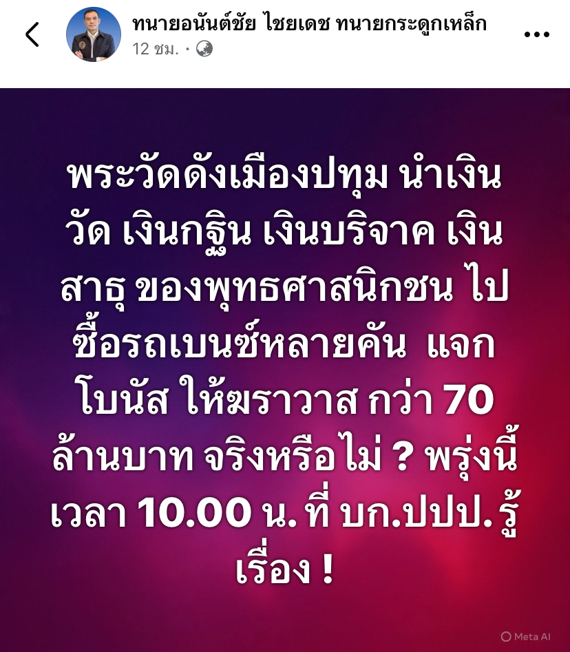 พระวัดดังเมืองปทุม นำเงินวัด เงินกฐิน เงินบริจาค เงินสาธุ ของพุทธศาสนิกชน ไปซื้อรถเบนซ์หลายคัน แจกโบนัส ให้ฆราวาส กว่า 70 ล้านบาท จริงหรือไม่ ? พรุ่งนี้ เวลา 10.00 น. ที่ บก.ปปป. รู้เรื่อง !