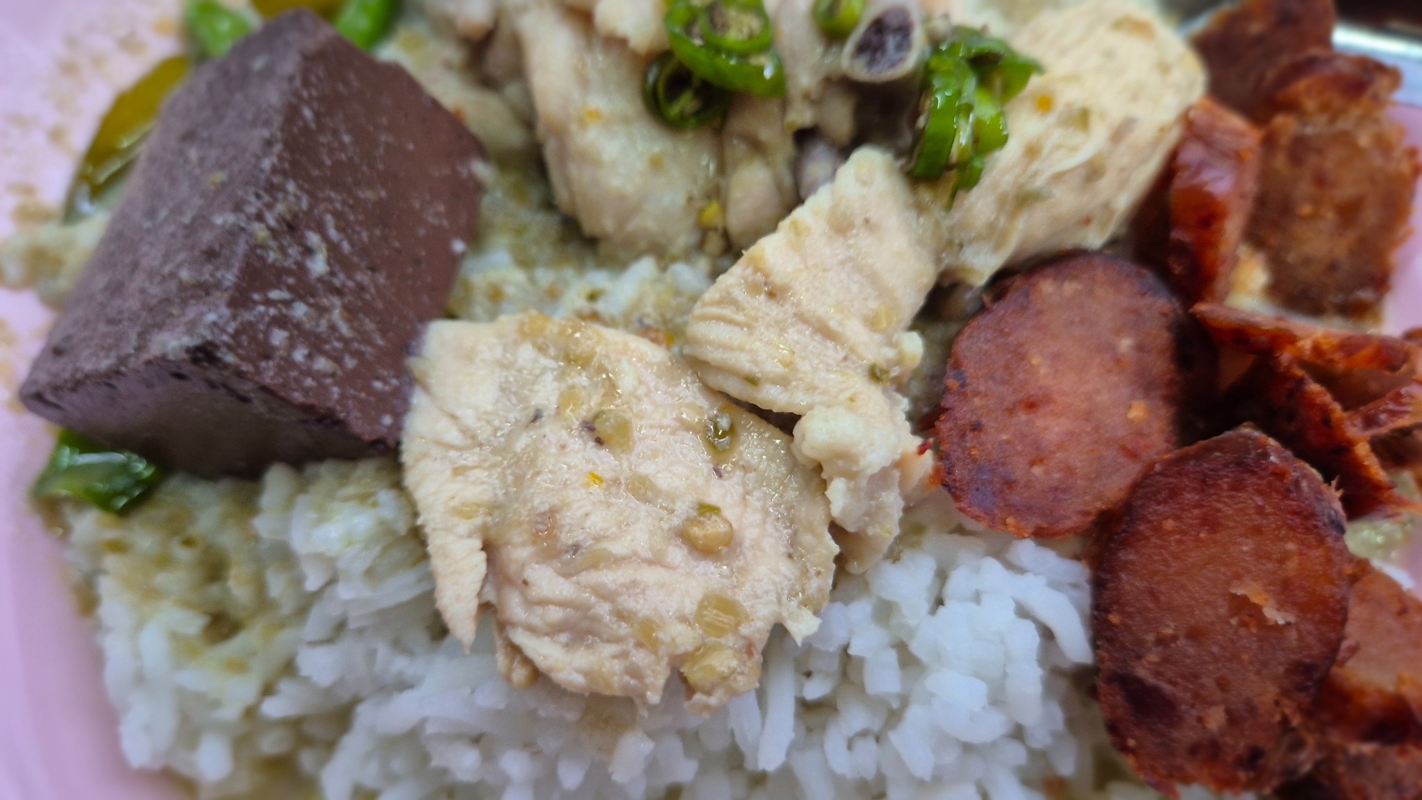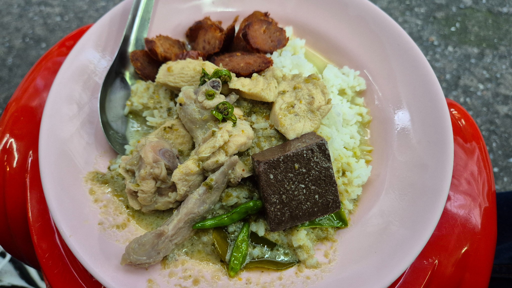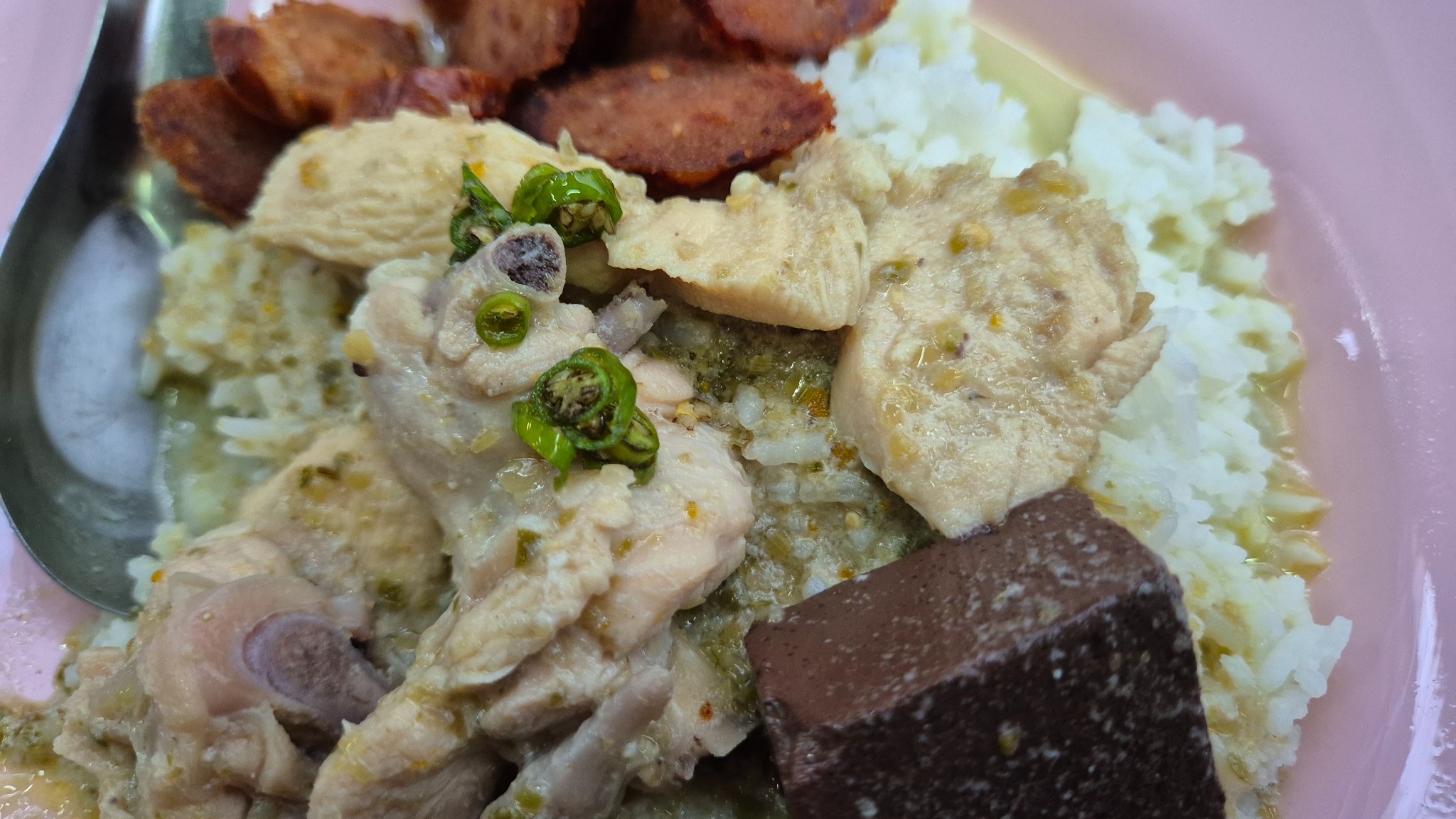 แกงไก่ราดข้าว เครื่องเคียงคือกุงเชียง