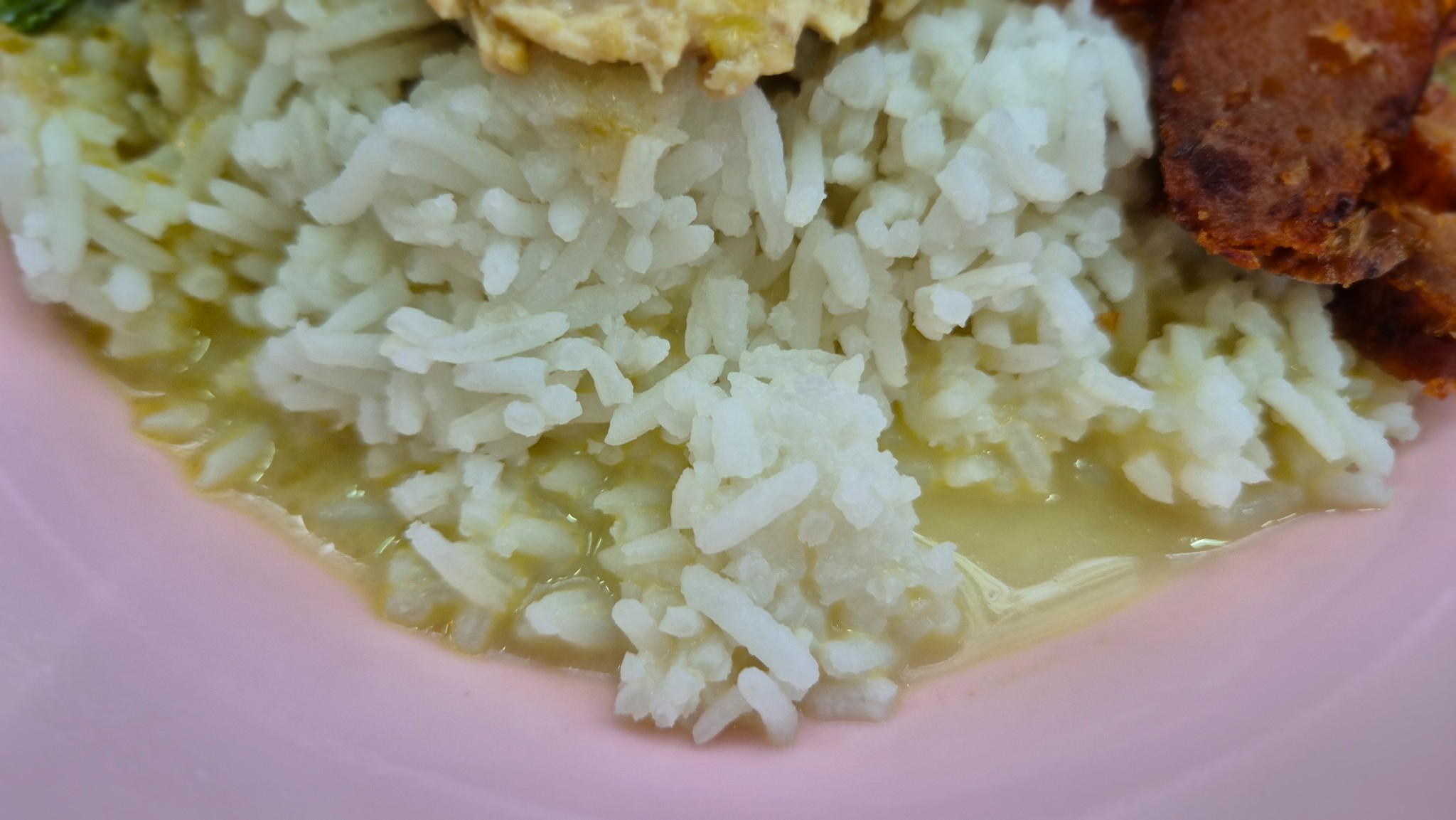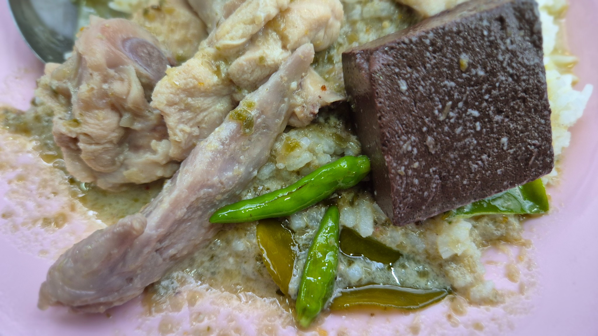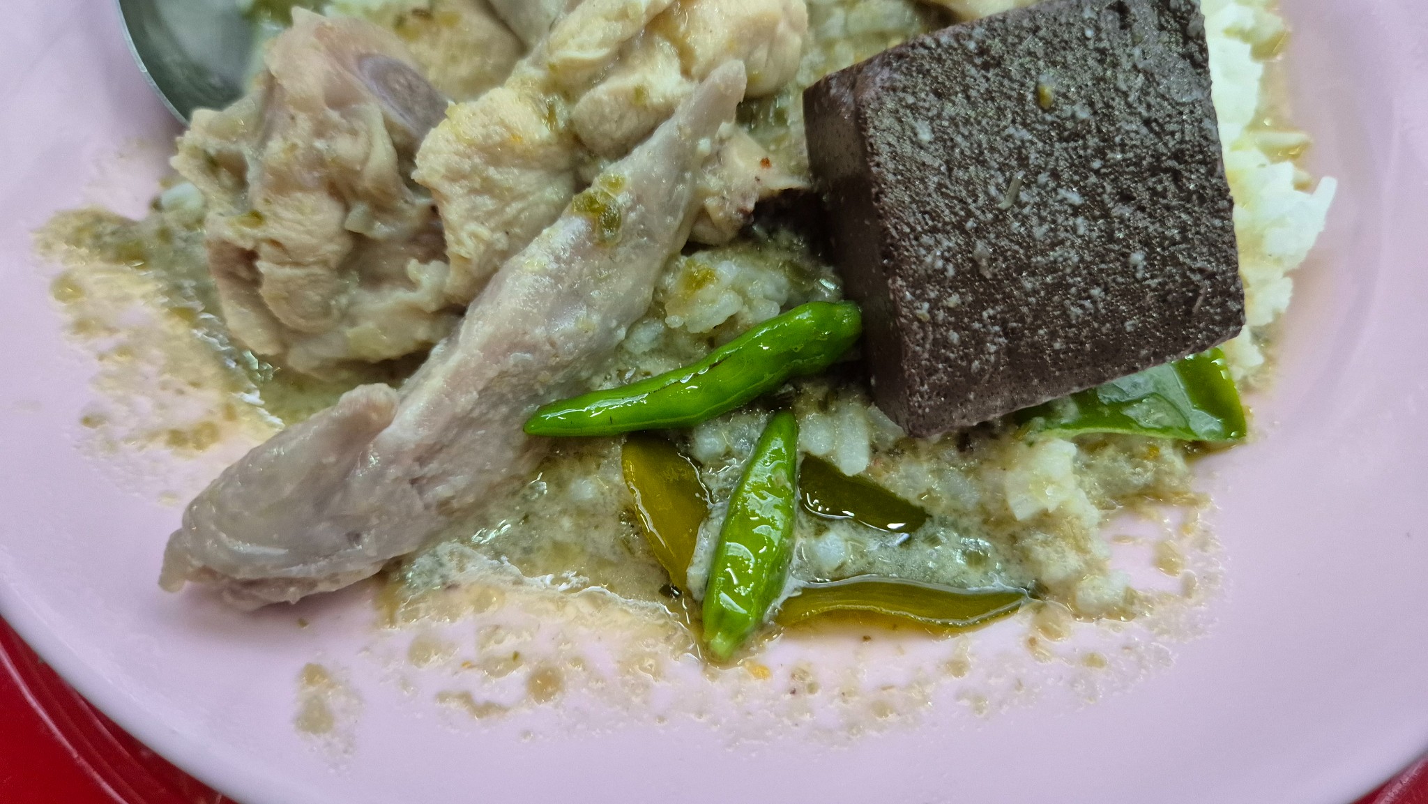 แกงไก่ราดข้าว เครื่องเคียงคือกุงเชียง