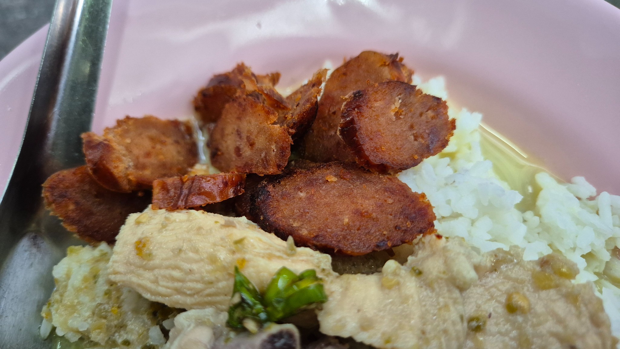 สองอย่าง 55 บาท แกงร้อนๆกุนเชียงหนึ่งกำ อร่อยดีมีเก้าอี้ดนตรี ยอมรับว่ามันอร่อยจริง และให้เยอะอิ่มกำลังดี มีแรงไปไหว้พระ(จันทร์)