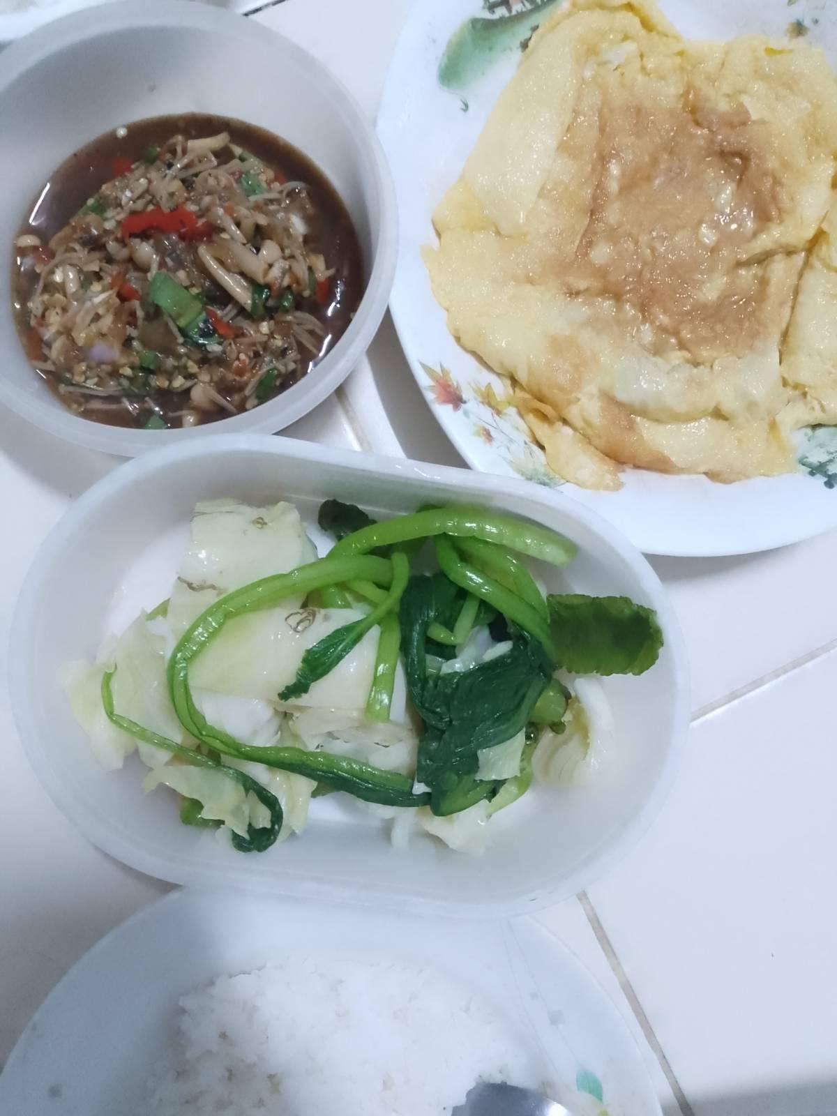 มื้อเย็นวันนี้(06/10/2568)กับมื้อเย็นเบาๆอย่าง"น้ำพริกเห็ดปลาร้า"กับ"ไข่เจียวร้อนๆ" แถมด้วยผักต้มต่างๆครับ😊😊😊