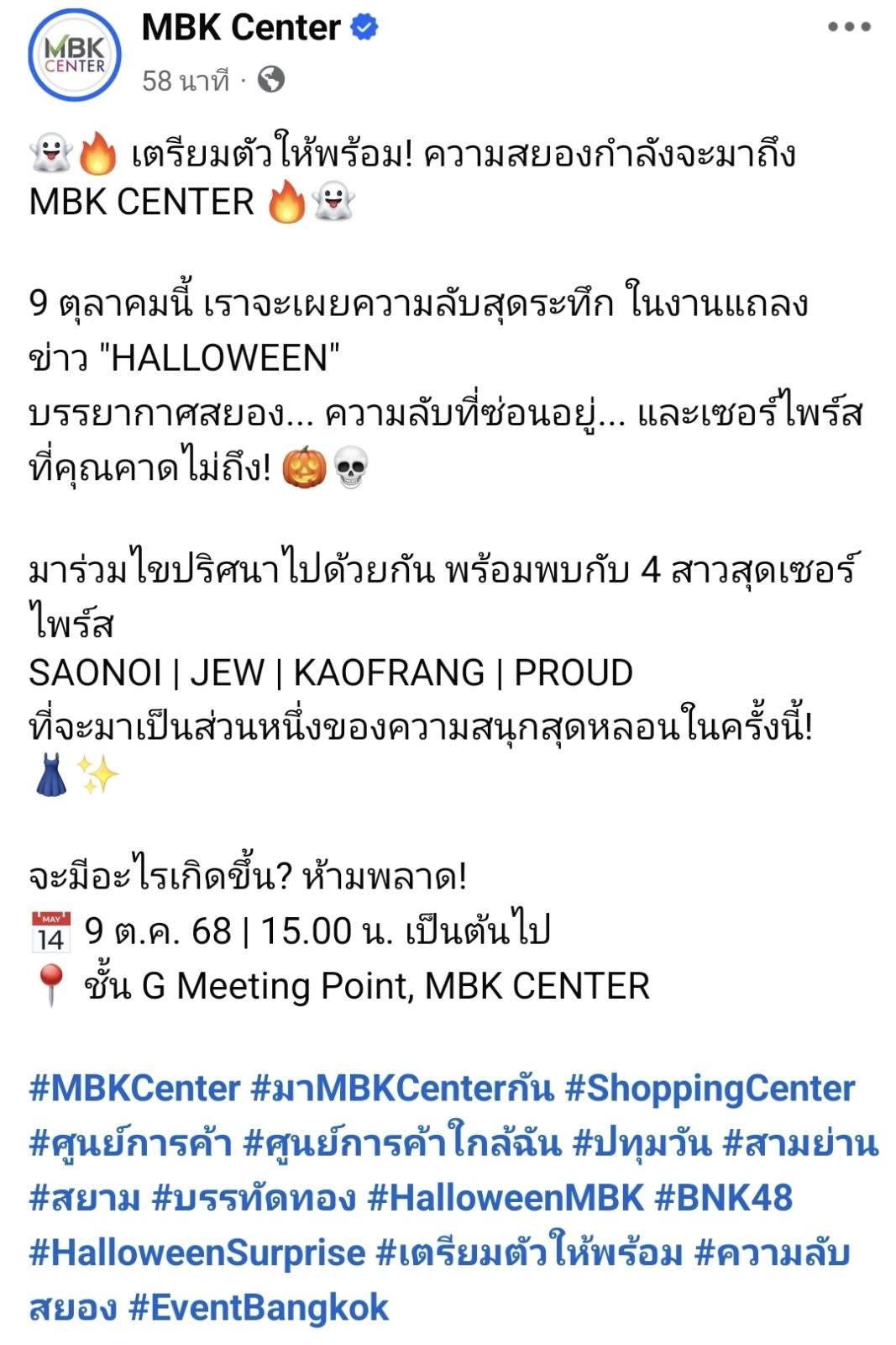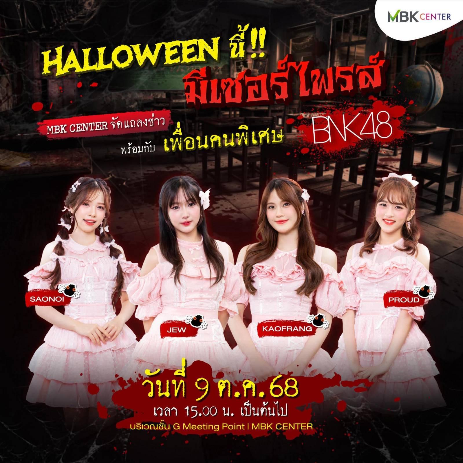 วันพฤหัสบดีนี้ที่ MBK Center มีจัดงานแถลงข่าวเกี่ยวกับกิจกรรมฮัลโลวีน มี 4 สมาชิกวง BNK48 (ข้าวฟ่าง สาวน้อย จิว ภราว) เข้าร่วมด้วย