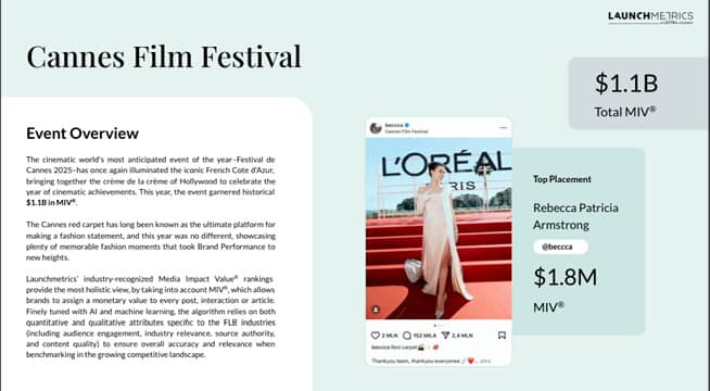 ที่งาน Cannes Film Festival 2025 เธอสร้างมูลค่า EMV ให้กับ L’Oréal Paris กว่า 11.1 ล้านเหรียญสหรัฐ เพียงคนเดียว หรือคิดเป็น 44.1% ของยอดรวมทั้งหมดของแบรนด์ในงานปีนั้น ถือเป็นอันดับสูงสุดในบรรดาอินฟลูเอนเซอร์ทั่วโลก ตามรายงานของ Vogue Business