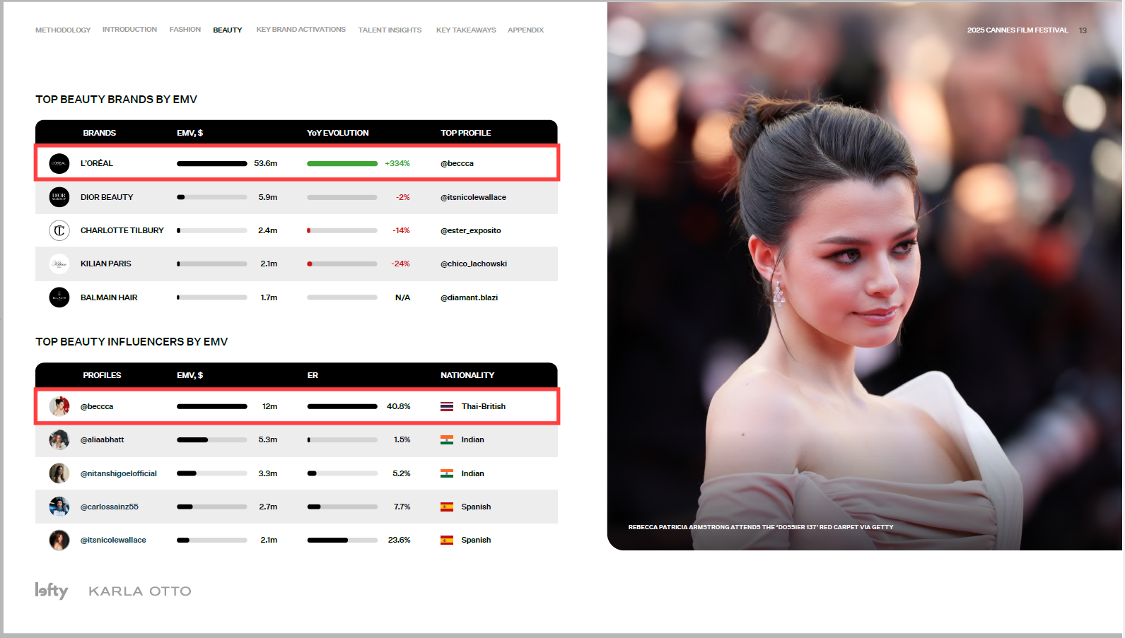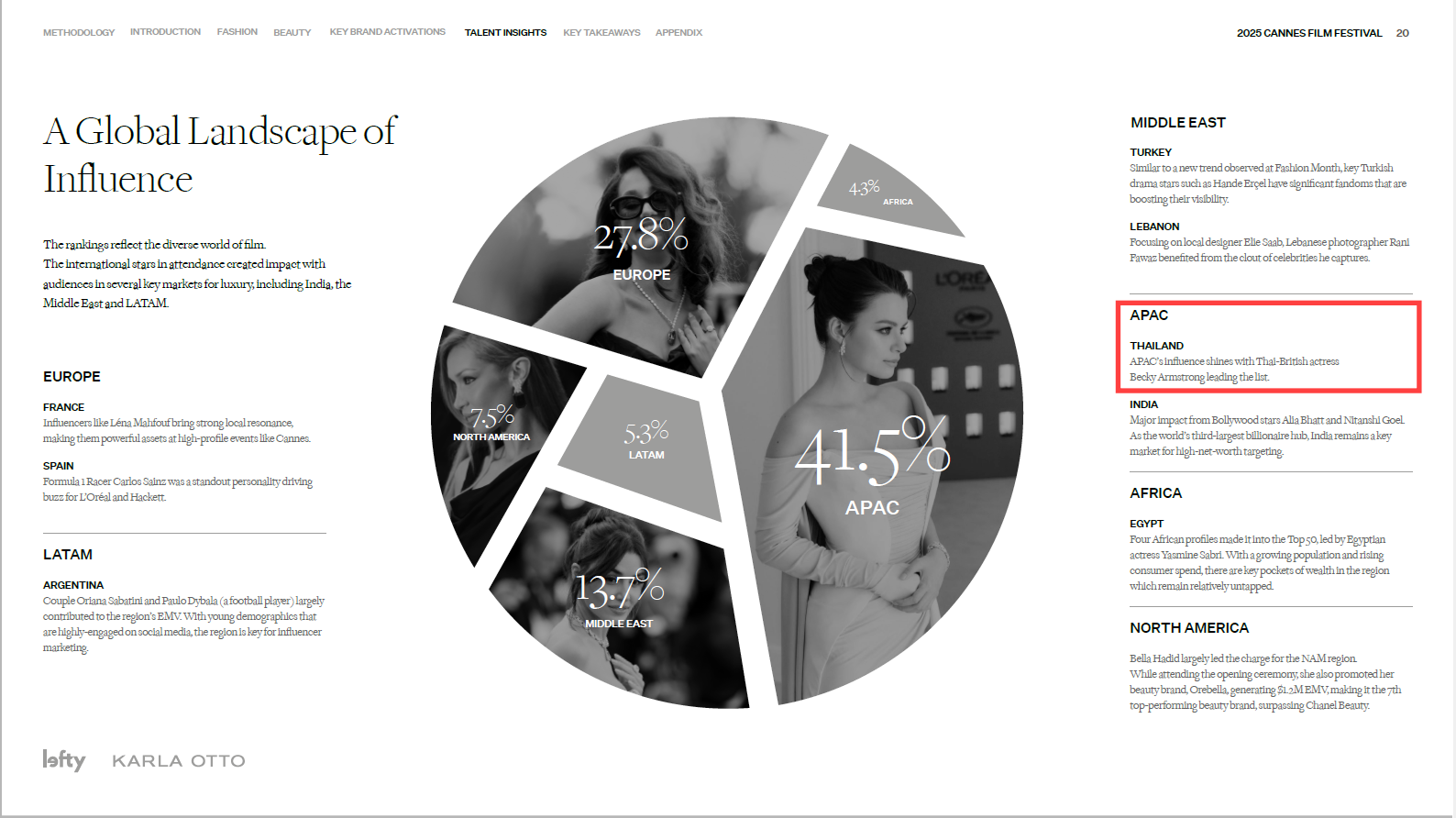 ในระดับมหภาค งาน Paris Fashion Week ล่าสุดมีมูลค่าสื่อรวมกว่า 649 ล้านเหรียญสหรัฐ โดยคนดังจากไทยและฟิลิปปินส์ครองสัดส่วนกว่า 30% ของมูลค่าที่ขับเคลื่อนโดยคนดัง ซึ่ง Becky ก็เป็นหนึ่งในรายชื่อที่แบรนด์ทั่วโลกติดตามในฐานะผู้สร้างอิมแพ็กต์หลัก