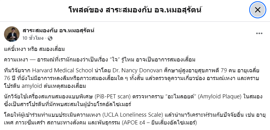 ผศ.นพ.สุรัตน์ ตันประเวช เผยงานวิจัยฮาร์วาร์ดพบความเชื่อมโยงน่าตกใจ: ผู้สูงอายุที่มีคราบโปรตีนอะไมลอยด์ (ต้นเหตุอัลไซเมอร์) สูง เสี่ยงเหงามากกว่าคนทั่วไปถึง 7.5 เท่า แนะอย่ามองข้ามความเหงาเรื้อรัง เพราะอาจเป็นเสียงเตือนจากสมองว่าโรคกำลังเริ่มต้น