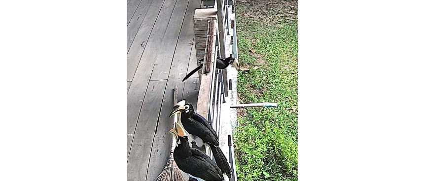 เรามีบ้านสวนอยู่ชายเขา เสาร์อาทิตย์จะเข้ามาพัก วันหนึ่งตื่นมาประมาณ 6 โมง เห็นตัวอะไรเกาะที่กิ่งไม้นอกหน้าต่างตอนแรกนึกว่าไก่ อ่าาาา ไม่ใช่ !! เธอคือนกเงือก สวยงามมาก ตอนแรกเห็นแค่ตัวเดียวแอบถ่ายรูปไปหาข้อมูลน่าจะเป็นพันธุ์นกแก๊ก ย้อนไปดูกล้องวงจรปิด อียยยย เธอมากันทุกวันเลยนะ มากัน 3 ตัว มาเกาะที่ขอบระเบียงบ้าน ตื่นเต้นๆ เคยไปส่องที่เขาสกยังไม่เคยเห็นเลย อันนี้มาให้ชมตัวเป็นๆ