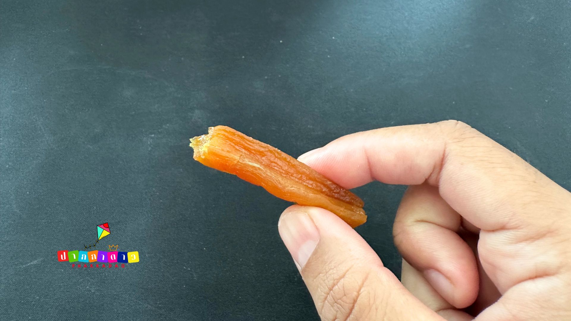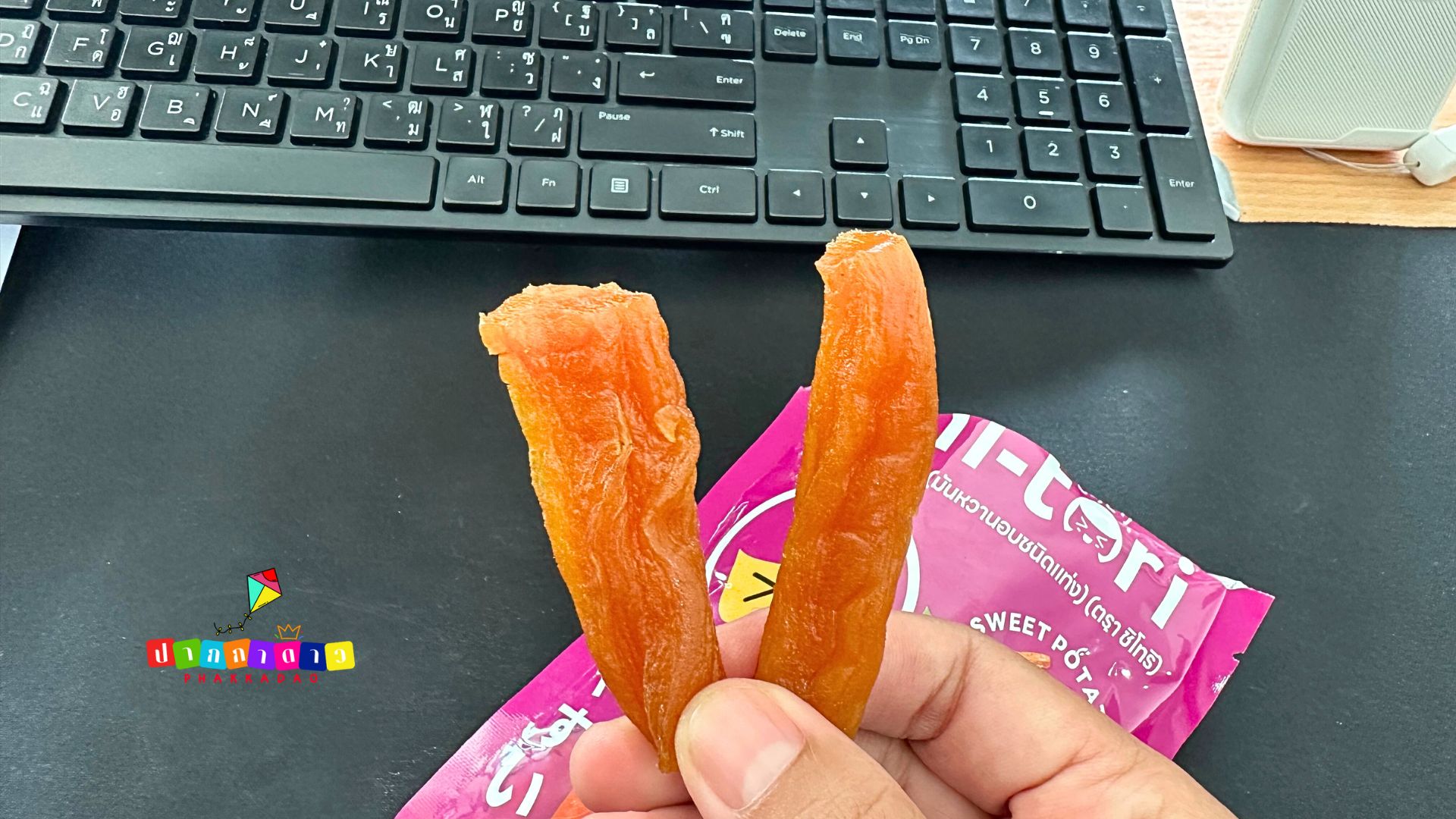 น้องคือมันหวาน เพียวไม่กี่ชิ้น 555+ เป็นแท่งสีส้มเข้ม ลักษณะเหมือนเส้นหนึบๆ คล้ายกับมันเชื่อมที่ถูกทำให้แห้งจนได้เนื้อเหนียวกำลังดี ไม่เละ ไม่แข็งเกินไป ถือแล้วไม่เหนียวติดมือมาก หวานธรรมชาติ หนึบๆดี