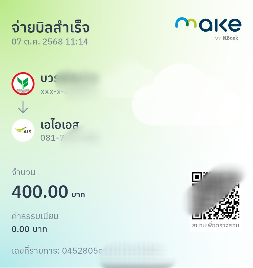 คือตอนเช้าลุงเน็ตหมดเลยจะสมัครเน็ตให้แก ระหว่างรอลุงดูโปรโมชั่น ก็ได้เติมเงินจำนวน 400 บาท ผ่านทาง App Make by Kbank ในแอพขึ้นทำรายการสำเร็จ มีสลิปขึ้นเรียบร้อย แต่ยอดเงินยังคง 0.00 ไม่ทราบว่าเกิดจากตัวแอพ หรือ ทางระบบเติมเงินครับ ตอนนี้ทะเลาะกันกับลุงแล้ว หาว่าเราไม่เติมให้ ทั้งที่เอาสลิปให้ดู ดาวน์มากครับ หวังดีประสงค์ร้าย TT