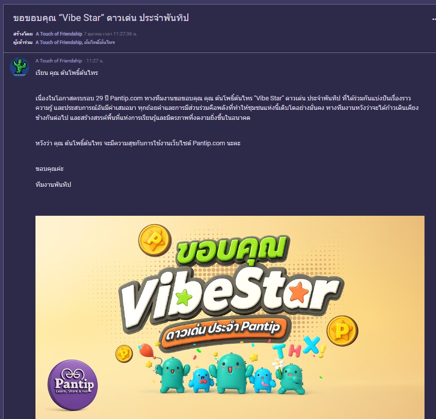 เนื่องในโอกาสครบรอบ 29 ปี Pantip.com ทางทีมงานขอขอบคุณ คุณ ต้นโพธิ์ต้นไทร "Vibe Star" ดาวเด่น ประจำพันทิป ที่ได้ร่วมกันแบ่งปันเรื่องราว ความรู้ และประสบการณ์อันมีค่าเสมอมา ทุกถ้อยคำและการมีส่วนร่วมคือพลังที่ทำให้ชุมชนแห่งนี้เติบโตอย่างมั่นคง ทางทีมงานหวังว่าจะได้ก้าวเดินเคียงข้างกันต่อไป และสร้างสรรค์พื้นที่แห่งการเรียนรู้และมิตรภาพที่งดงามยิ่งขึ้นในอนาคต