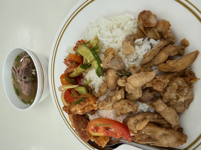 มีขนมจีนแกงเขียวหวานเนื้อและไก่ จัดเขียวหวานเนื้อมา 1 จาน กับผัดหมี่ชมพูอีก 1 จาน ต่อท้ายด้วย ไอศครีมอีก 1 ถ้วย อิ่มแน่นมากจุกๆ