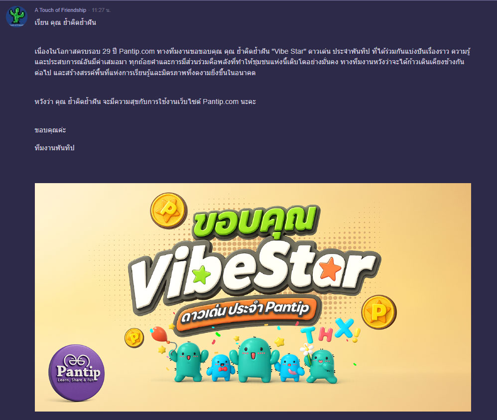 ขอขอบคุณทีมงานพันทิป ที่มอบรางวัล “Vibe Star” ดาวเด่น ประจำพันทิป ให้นะคะ
