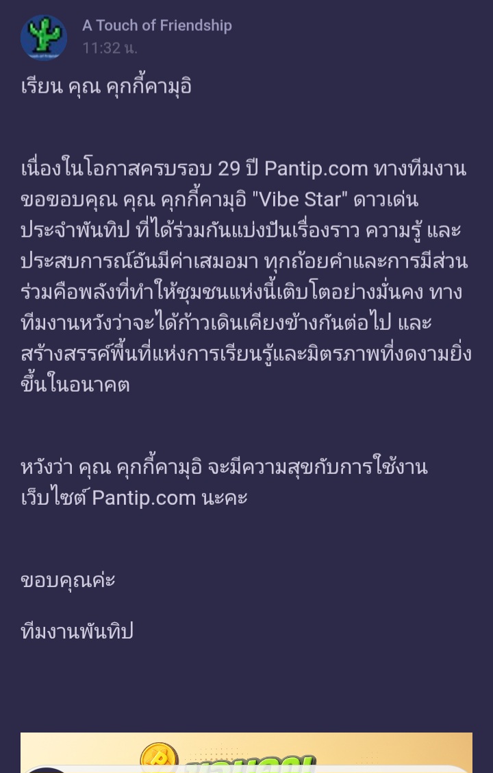 ดีใจ ชื่นใจ สุขใจ ได้รับจดหมายจากสาวพันทิป A Touch of Friendship ... เรียน คุณ ต้นโพธิ์ต้นไทรเนื่องในโอกาสครบรอบ 29 ปี Pantip.com ทางทีมงานขอขอบคุณ คุณ ต้นโพธิ์ต้นไทร "Vibe Star"