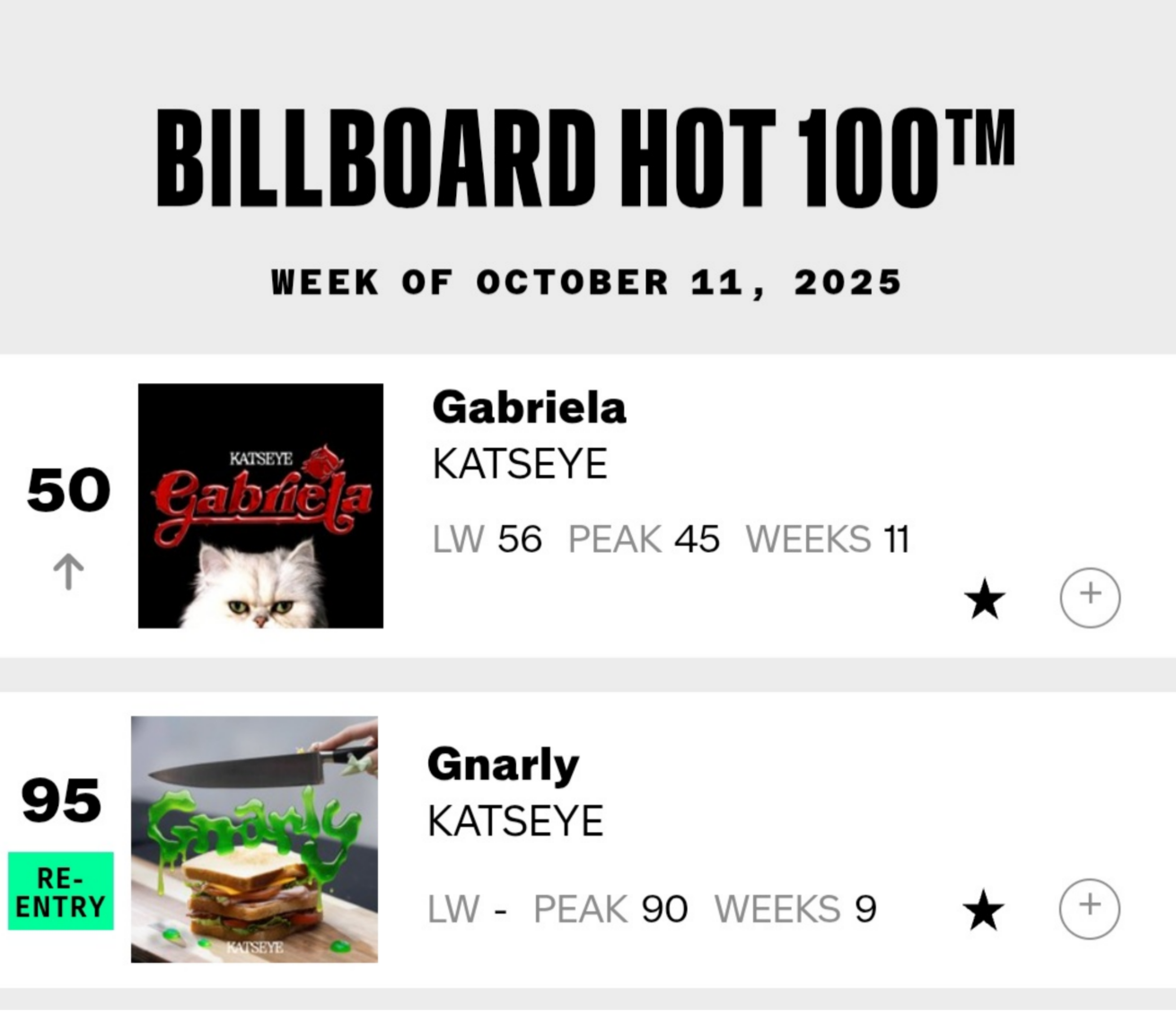 เพลง "Gabriela" ของ KATSEYE อยู่อนดับที่ #50 บนชาร์ต Billboard HOT 100 ประจำสัปดาห์นี้ [สัปดาห์ที่ 11]