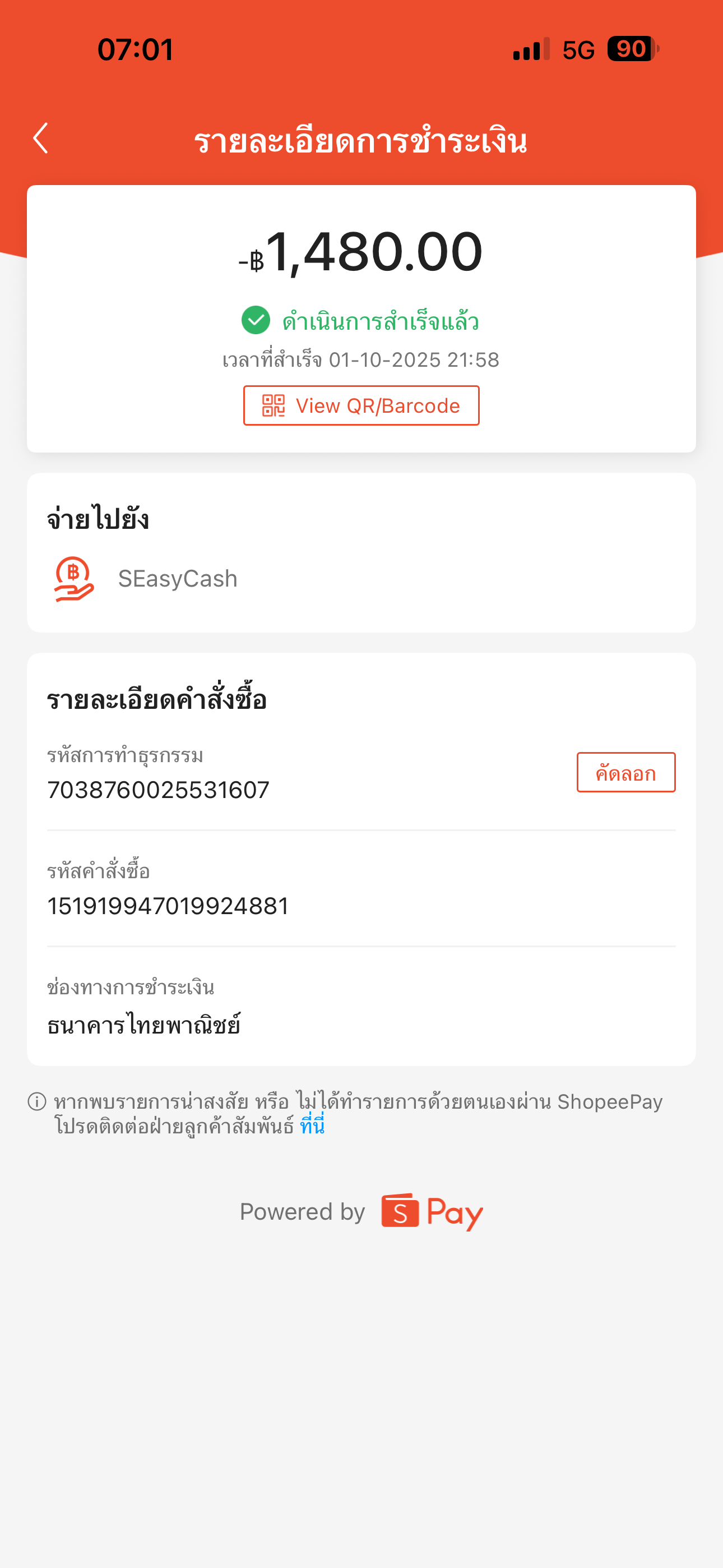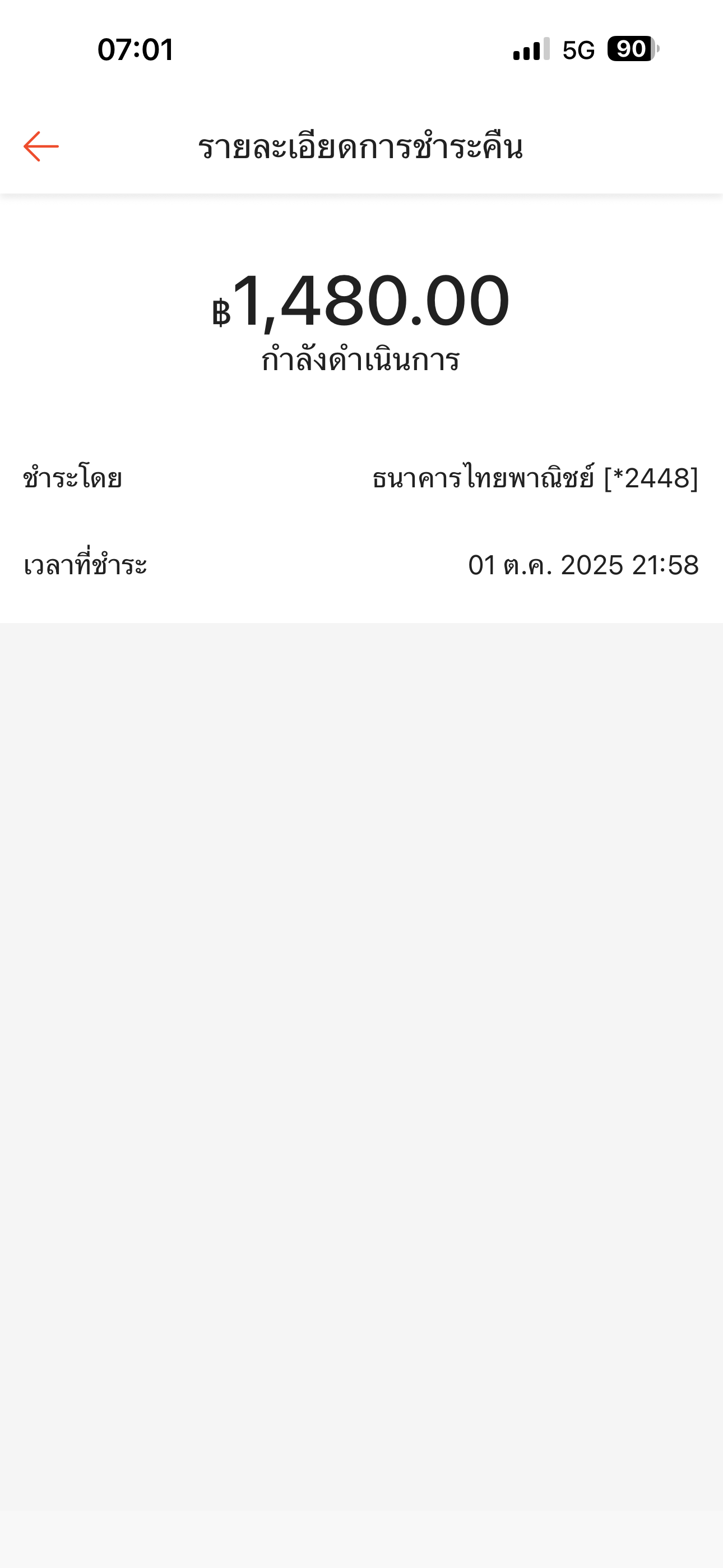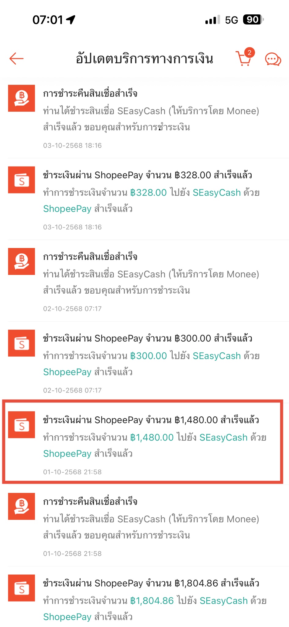 เมื่อวันที่ 1 ตุลาคม 2568 เวลา 21.58 น. มีการชำระเงินล่วงหน้าเข้าไปใน SEasyCash เป็นเงิน 1,480 บาท โดยทางบัญชีธนาคารไทยพาณิชย์ได้หักยอดเงินเป็นที่เรียบร้อย แต่ทาง SEasyCash ยังไม่มีการปรับวงเงินคืนให้ และประวัติชำระสินเชื่อยังคงขึ้นว่า กำลังดำเนินการ รวมวันนี้ก็ 6 แล้ววันค่ะ
