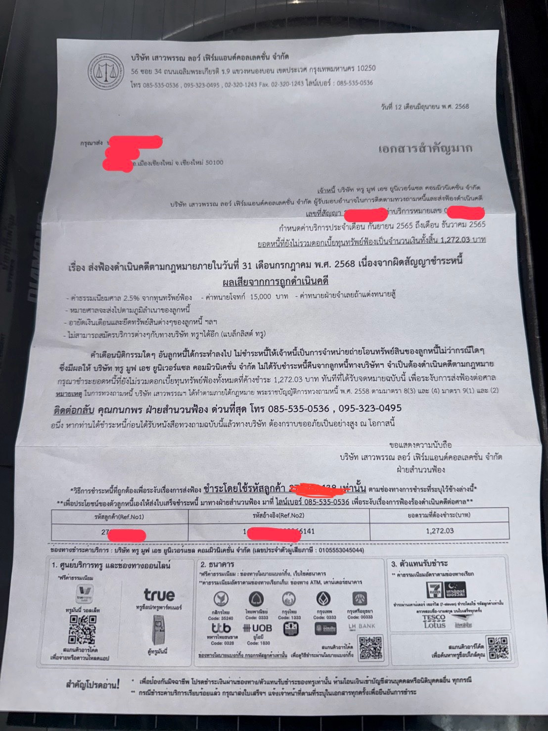 โดนจดหมายทวงหนี้จะดำเนินคดี เพราะค้างจ่าย แต่เบอร์โทรนี้ถูไม่รู้จัก ไม่เคยใช้ ไม่เคยรู้ว่ามีเบอร์นี้อยู่ในโลก ก็เลยไปแจ้งความแล้วก็ไปติดต่อที่ช็อป แต่ได้การแก้ปัญหาที่ห่วยแตกมาก บอกแค่ว่าต้องส่งให้ฝ่ายกฎหมายตรวจสอบ บอกแค่ว่าสมัยก่อนสามารถแค่มีเอกสารก็เปิดเบอร์ได้ บริษัทก็ออกใหญ่โต ไม่สังเกตหน่อยเลยหรอว่าคนที่ไปเปิดเบอร์ กับคนที่อยู่ในรูปในเอกสารหน้าตาไม่ตรงกัน ทำไมถึงได้ใช้เอกสารคนอื่นเปิดเบอร์ให้ใครก็ไม่รู้ได้ แล้วแจ้งว่าเบอร์นี้เปิดมานานแล้ว แต่ไม่เคยมีเอกสารอะไรที่เกี่ยวข้อง กับเบอร์นี้ส่งมาเลย โดยปกติถ้าค้างจ่าย จะต้องมีเจ้าหน้าที่โทรตาม จะต้องมีเอกสารส่งที่บ้าน แต่นี่ไม่เคยมีเอกสารส่งไปที่บ้านเลย ที่ทำงานก็ไม่มีเอกสารนี้ส่งไป ส่งมาอีกทีก็คือบอกจะดำเนิน