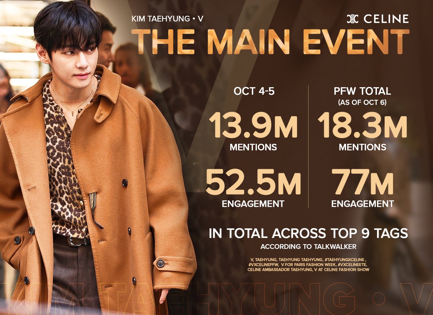 สำนักข่าวเกาหลีรายงานว่า V BTS สร้างยอด Engagement ทะลุ 77 ล้านครั้ง ระหว่างเข้าร่วมงานแฟชั่นโชว์ CELINE ที่ปารีส