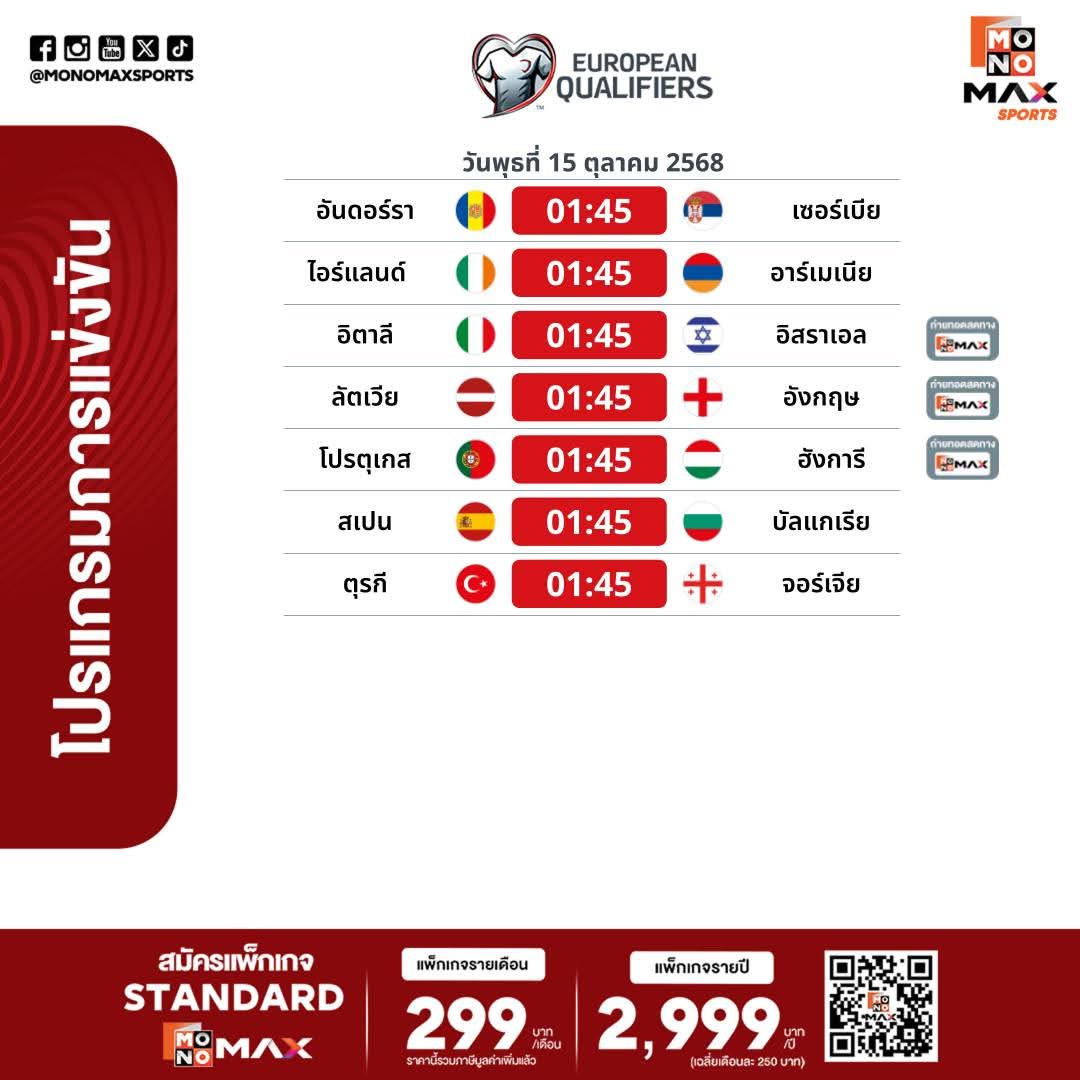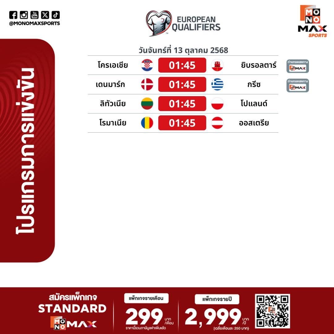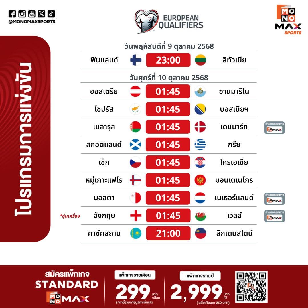Monomax เพิ่ม UEFA European Qualifiers “ฟุตบอลโลก 2026 รอบคัดเลือกโซนยุโรป” ในราคาเดิม AIS 199 หรือ Monomax 299 บาท