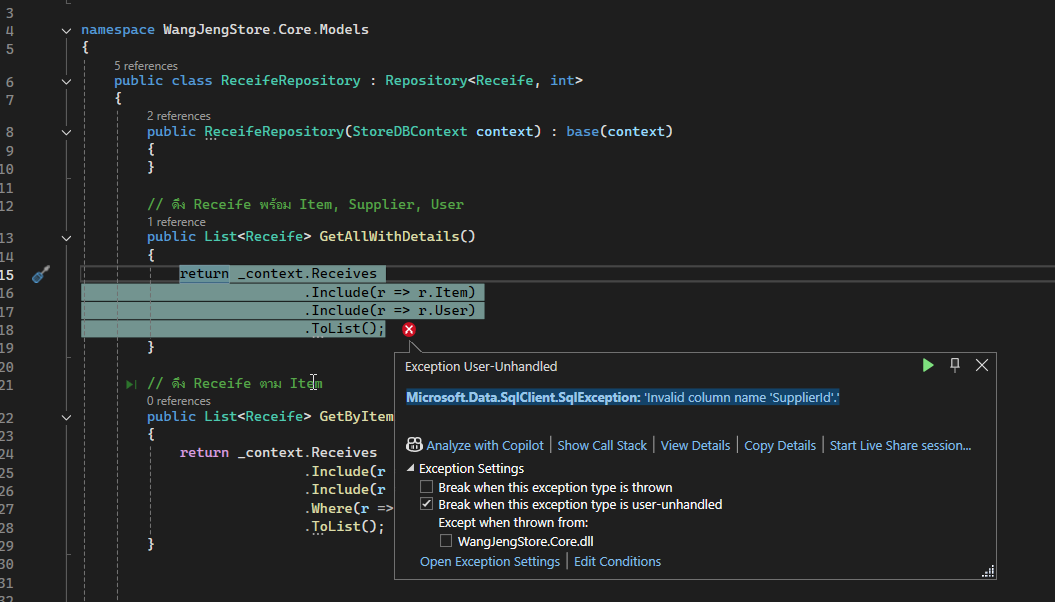 เดิมใน Receife มี SupplierId อยู่ พอผมตัดออกก็ตัดทั้งใน ตาราง และในคลาส Receife.cs ReceifeRepository.cs