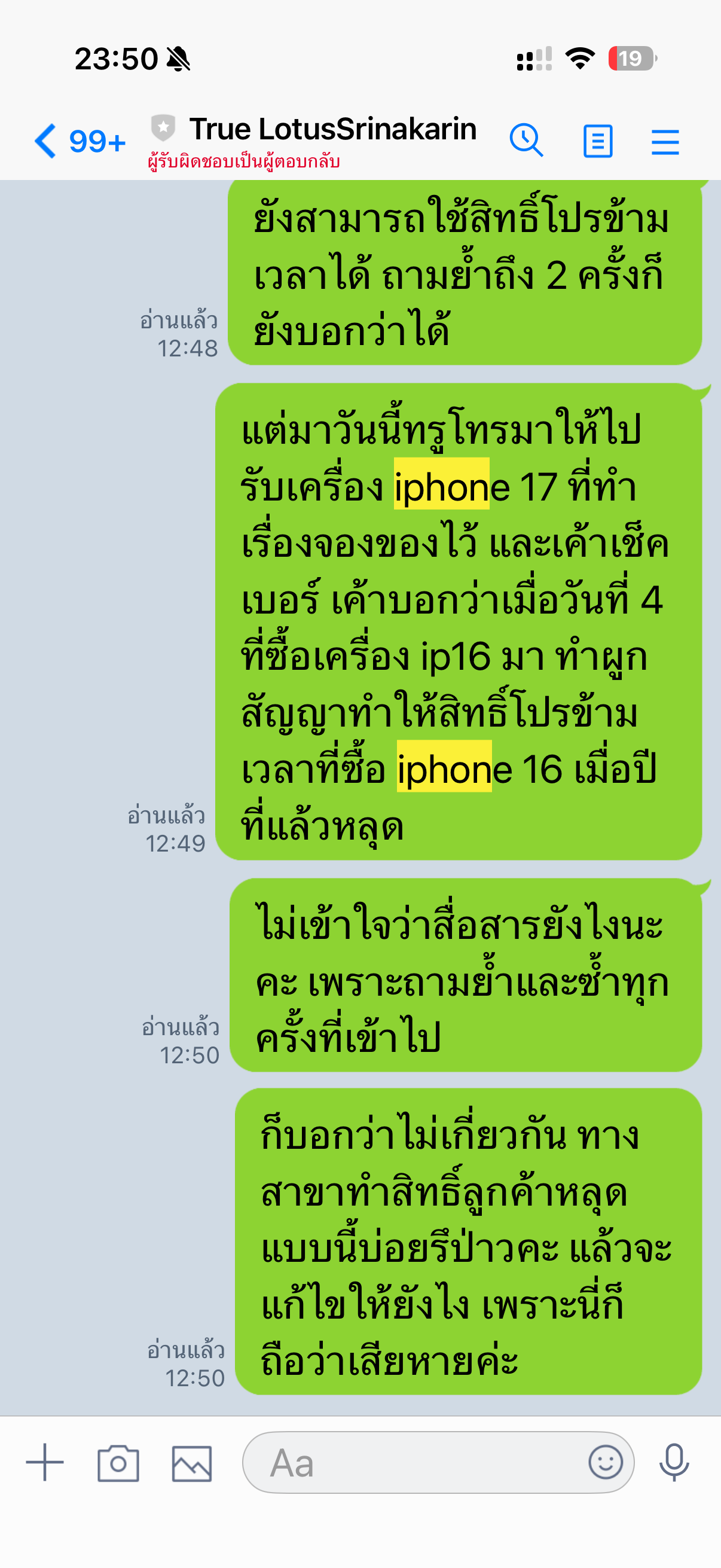 แต่นี่เราถามแล้วแต่พนักงานยืนยันว่ามันคนละส่วนกัน และคนที่รูดก็ไม่ได้แจ้งเรา และพอถึงเวลาเกิดปัญหาพนักงาน ไม่มีความรับผิดชอบโยนความผิดให้เราและใช้คำพูดไม่ดี ไม่มีความรับผิดชอบโยนความผิดให้เราและใช้คำรุนแรงว่าให้เราควรใช้เซ้นแบบนี้มันถูกต้องหรอคะพนักงาน ทรูสาขาโลตัสศรีนครินทร์