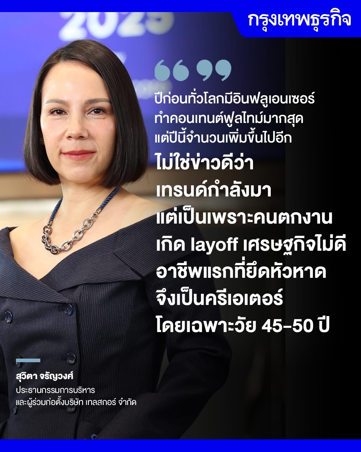 "ปีก่อนทั่วโลกมีอินฟลูเอนเซอร์ทำคอนเทนต์ฟูลไทม์มากสุด แต่ปีนี้จำนวนเพิ่มขึ้นไปอีก ไม่ใช่ข่าวดีว่าเทรนด์กำลังมา แต่เป็นเพราะคนตกงาน เกิด layoff เศรษฐกิจไม่ดี อาชีพแรกที่ยึดหัวหาดจึงเป็นครีเอเตอร์ โดยเฉพาะวัย 45-50 ปี"