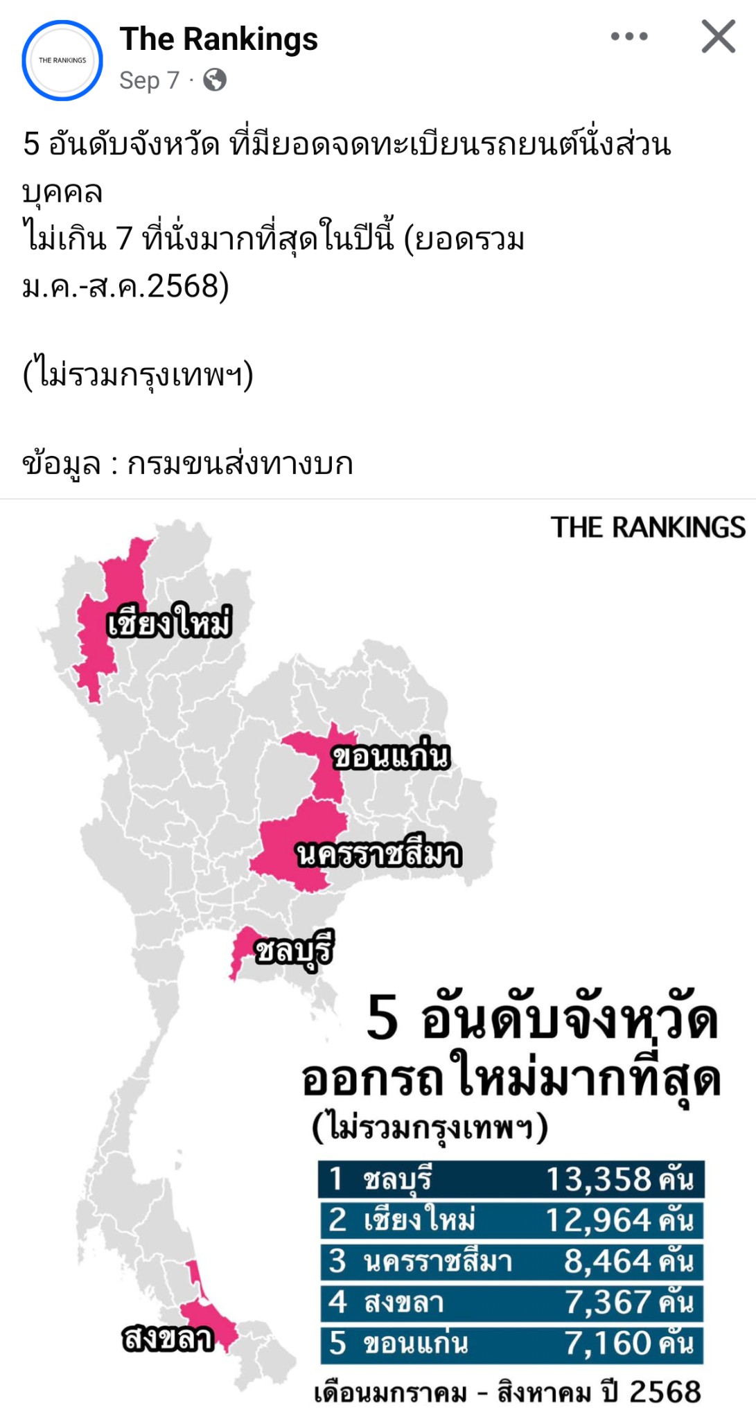 5 อันดับจังหวัดจดทะเบียนรถใหม่ ปี2568 ไม่รวมกทม.