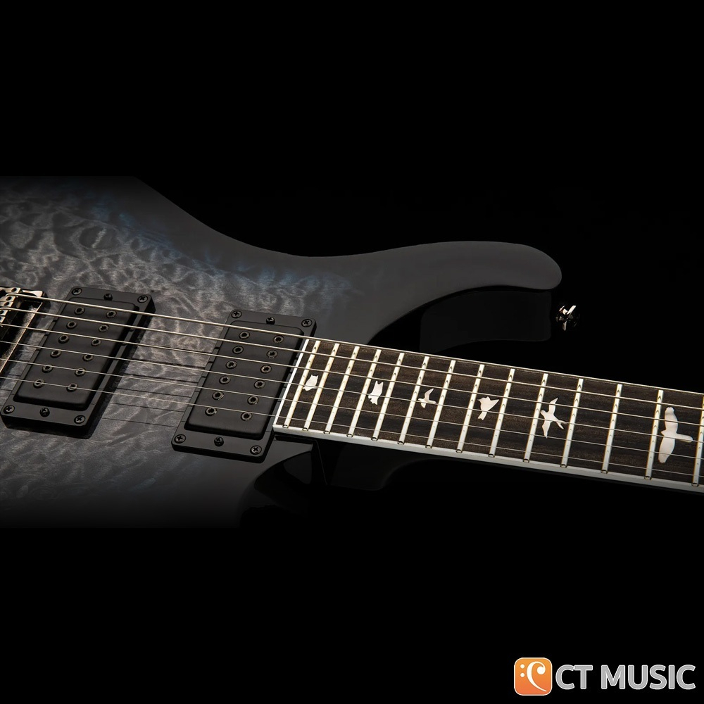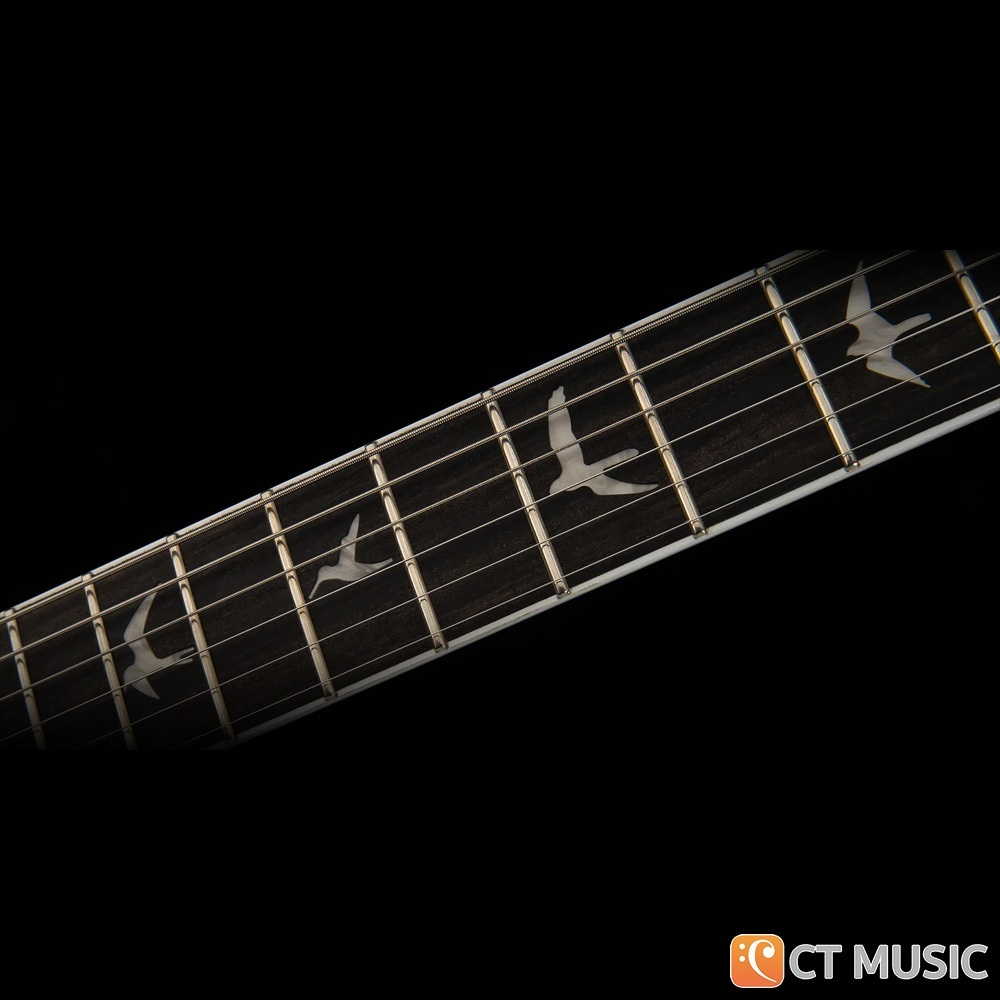 คอไม้เมเปิลเคลือบซาติน ลดความฝืดของมือ โปรไฟล์คอ Wide Thin บางพอดี จับคอร์ดและโซโล่ได้ถนัด ฟิงเกอร์บอร์ด Ebony มีความแข็งแน่น กดแล้วเสียงชัด ตอบสนองไว อินเลย์ลายนก (Birds) ซิกเนเจอร์ของ PRS ช่วยให้มองตำแหน่งเฟรตง่ายขึ้น