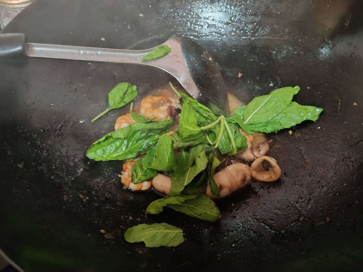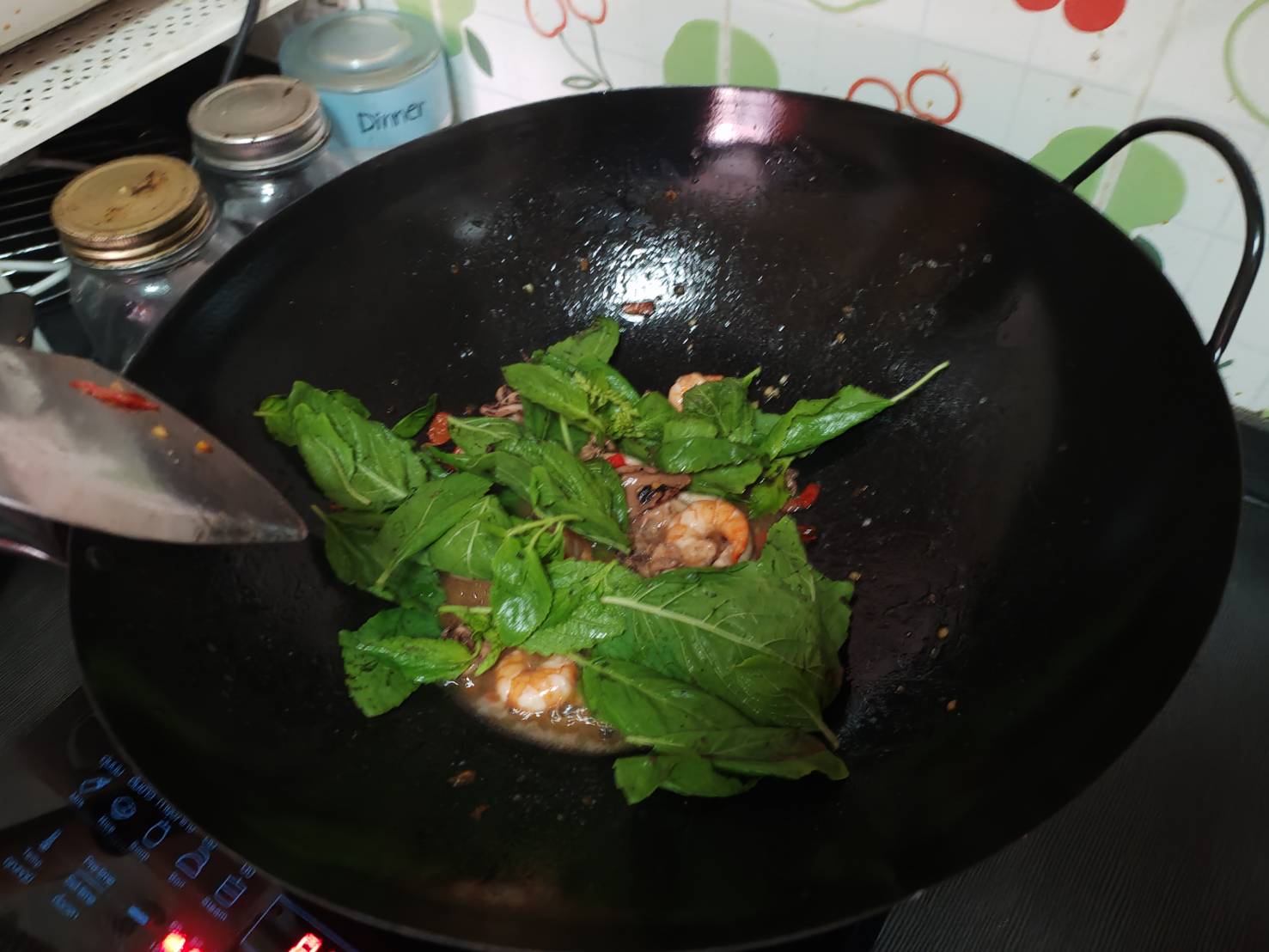 สุดท้ายโปะ ใบกะเพราลงไป คลุกๆผัดๆ ให้เข้าที่ ฟุดฟิด ฟุดฟิด