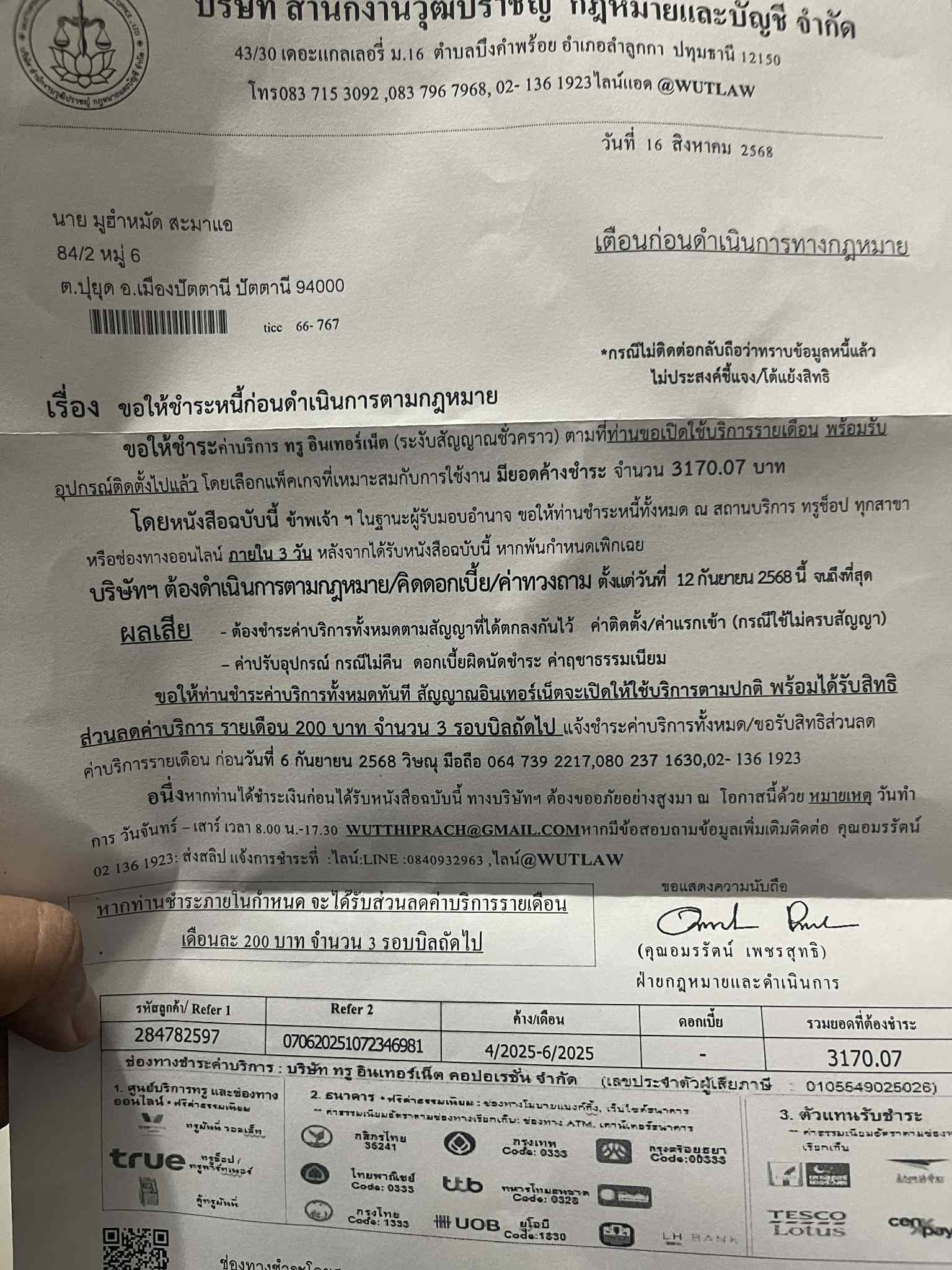 จดหมายจาก บริษัท สำนักงานกฎหมายธญาณชัย ส่งมาที่ออฟฟิศที่ทำงาน ยอดตั้งแต่เดือนเมษา-ธันวา ปี66 ซึ่งช่วงเมษาปี66 เราได้ย้ายที่อยู่ใหม่และยังไม่ได้ไปยกเลิกบริการ และช่วงเวลานั้นทางทรูได้ติดต่อมาให้ชำระค่า