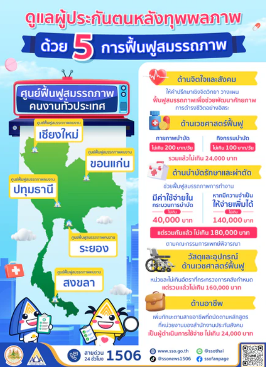 ทางประกันสังคมมีหลักสูตรให้ผู้ทุพพลภาพ เลือกได้ตามความถนัด 22 หลักสูตร โดยเข้าร่วมที่ศูนย์ฟื้นฟูสมรรถภาพคนงานทั่วประเทศ