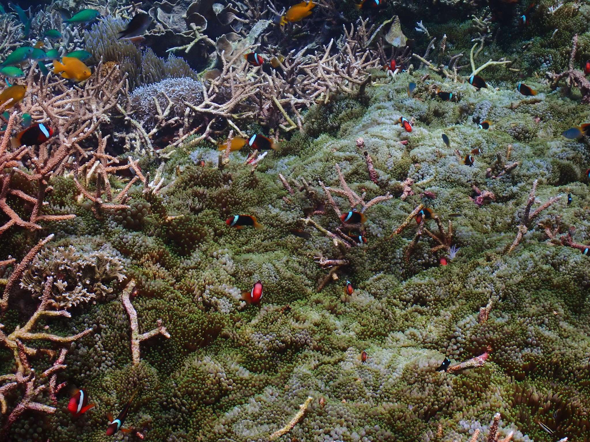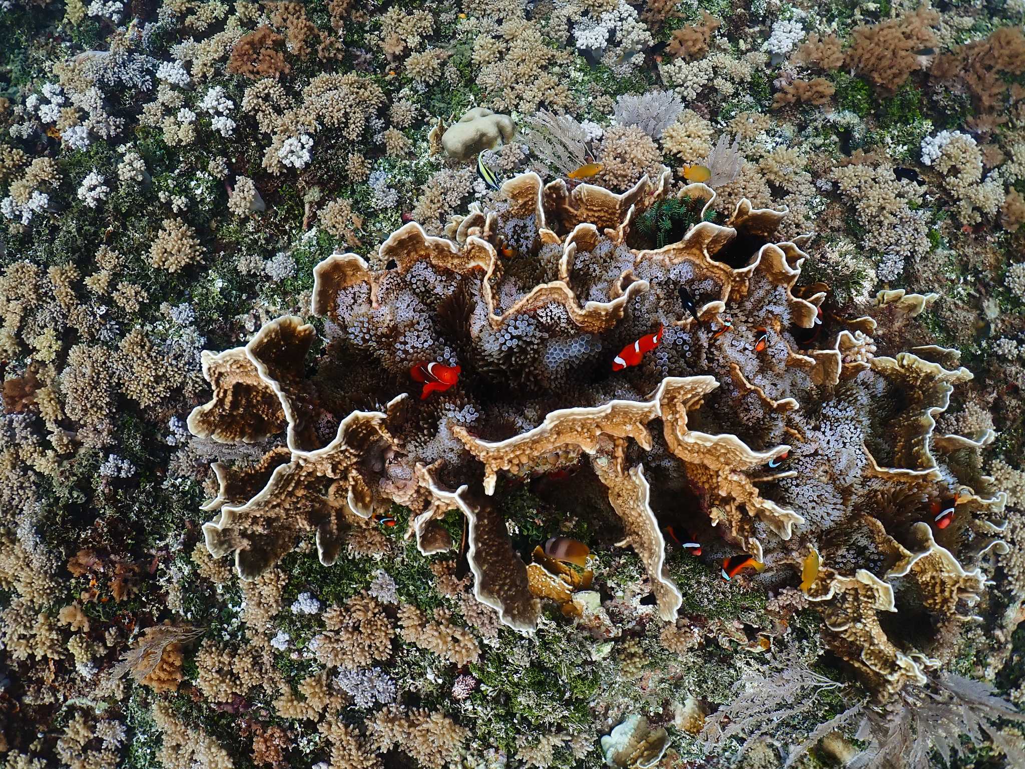 หมู่บ้านปลานีโม่ที่มีปราการเป็นปะการังแข็ง และล้อมรอบด้วยทุ่งปะการังอ่อน