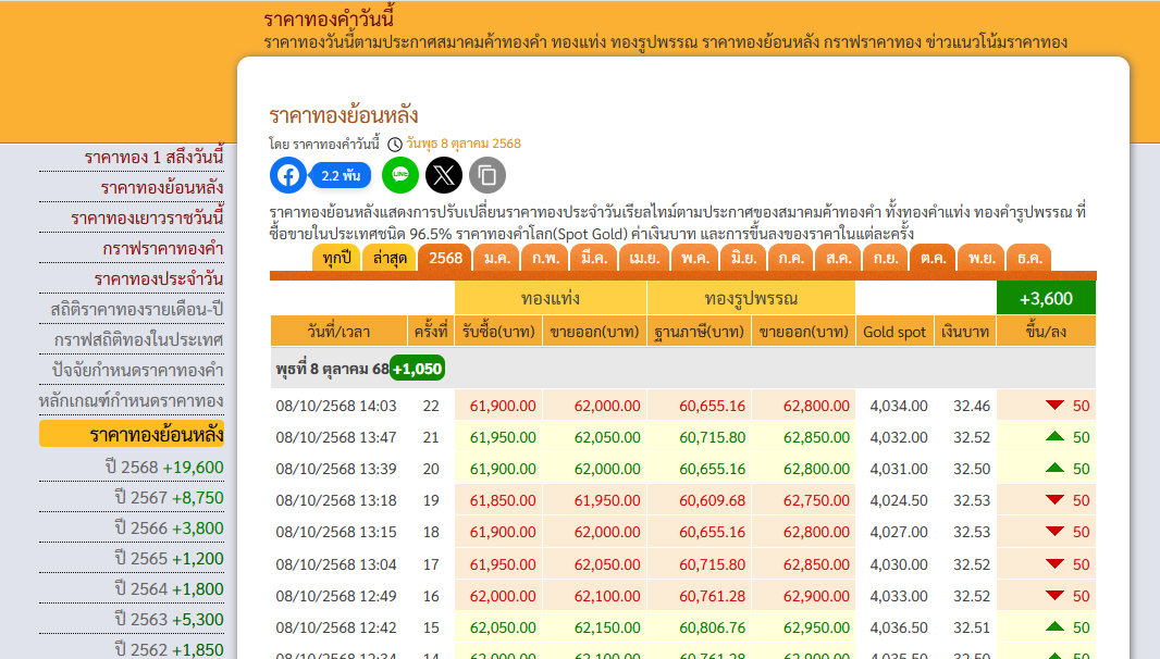 (8 ตุลาคม) ราคาทองคำในประเทศวันนี้เปิดตลาดปรับตัวสูงขึ้นอย่างร้อนแรงถึง 500 บาท ตั้งแต่ช่วงเช้า และยังคงปรับขึ้นอย่างต่อเนื่องตลอดทั้งวัน โดยสมาคมค้าทองคำประกาศราคาครั้งที่ 1 ณ เวลา 09.04 น. ทอง