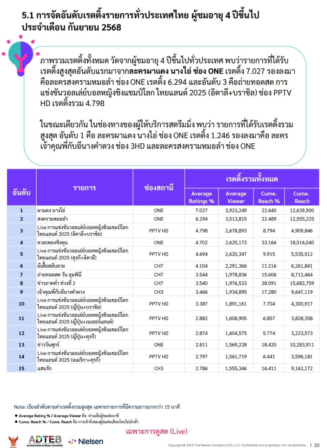 🔎 รายงานเรตติ้งทีวีดิจิทัลข้ามแพลตฟอร์ม (Cross Platform Rating) ประจำเดือนกันยายน 2568