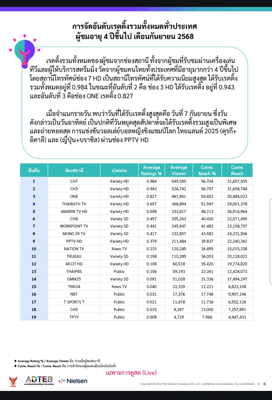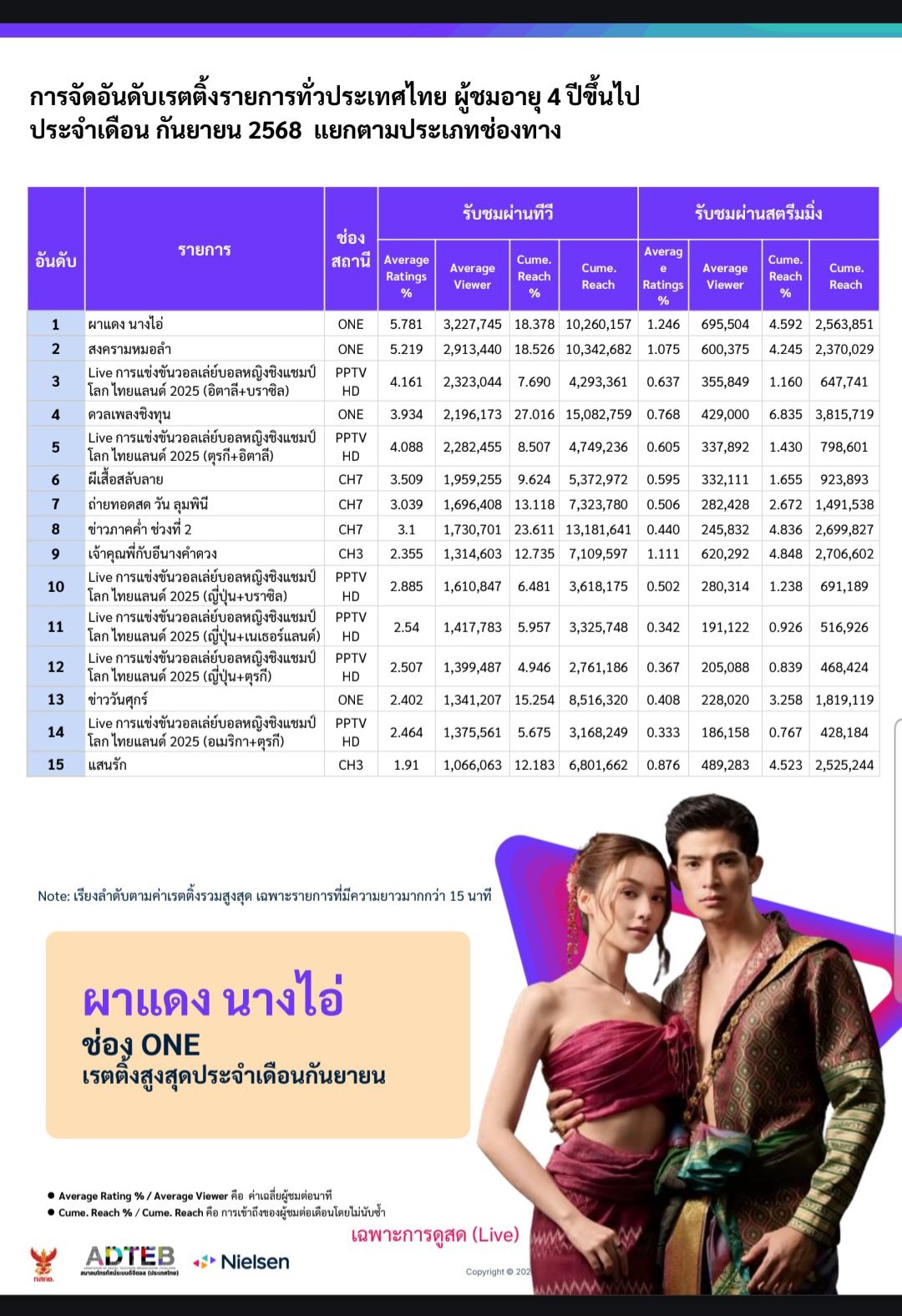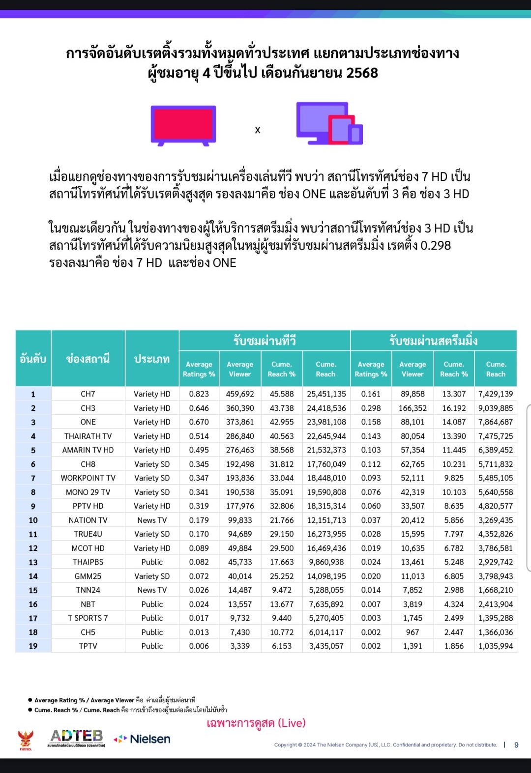 เรตติ้งประจำเดือน กันยายน 2568 ช่อง7 ยังอันดับ1