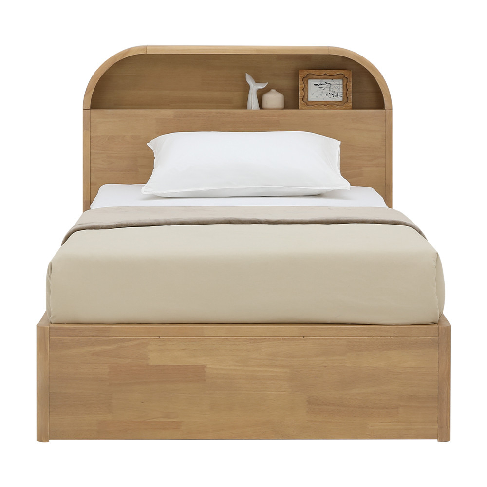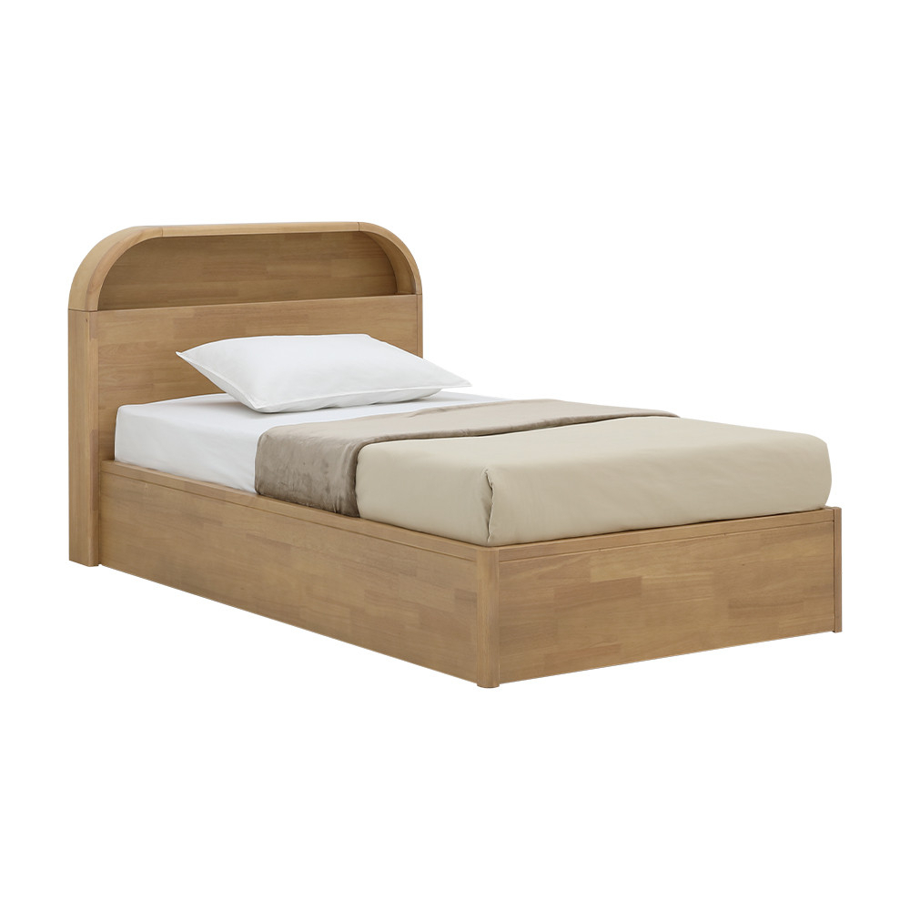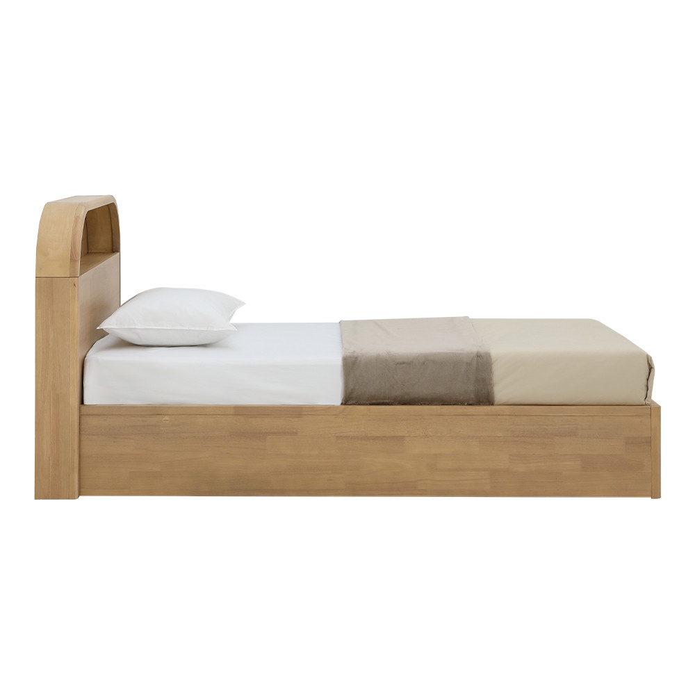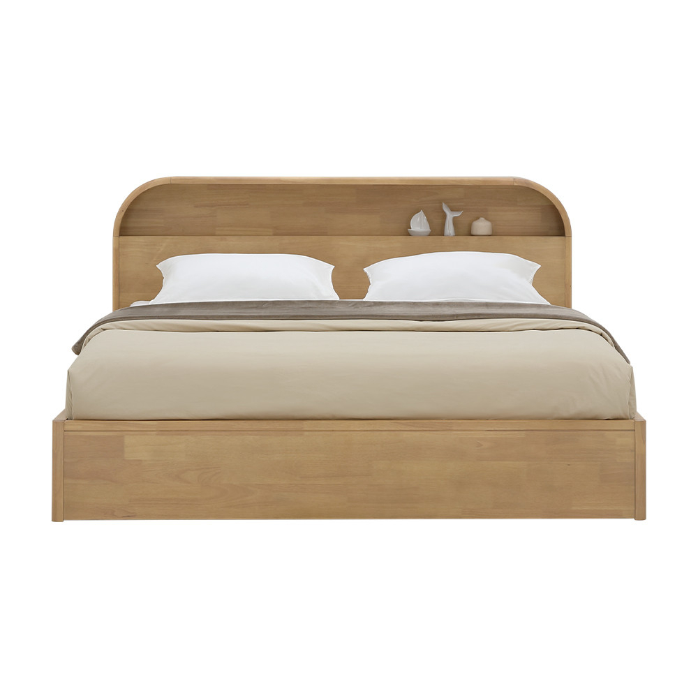 เปลี่ยนห้องนอนให้อบอุ่นและเป็นระเบียบด้วย เตียงนอน อาโอโมริ INDEX LIVING MALL ดีไซน์โค้งมนสไตล์ Japandi ทำจากไม้ยางพาราพ่นสีโทนวอร์มโอ๊ค หัวเตียงโค้งมีช่องวางหนังสือ/ของใช้หยิบง่าย