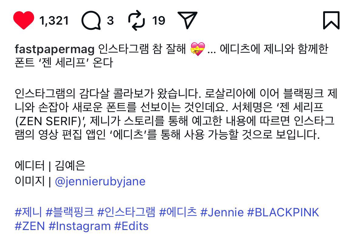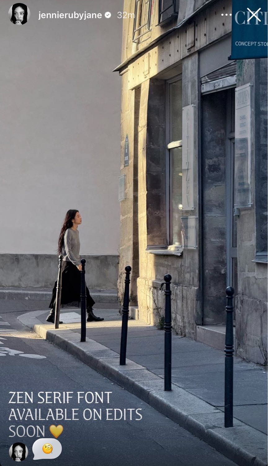 สื่อ fastpapermag รายงานว่า เจนนี่จะจับมือคอลแลปกับ Instagram ทำฟ้อนต์ใหม่ “ZEN SERIF” ใช้งานบนแอป Edits เป็นแอปตัดต่อวิดีโอของ Instagram จากสตอรี่ของเจนนี่บอก SOON น่าจะมาเร็วๆนี้