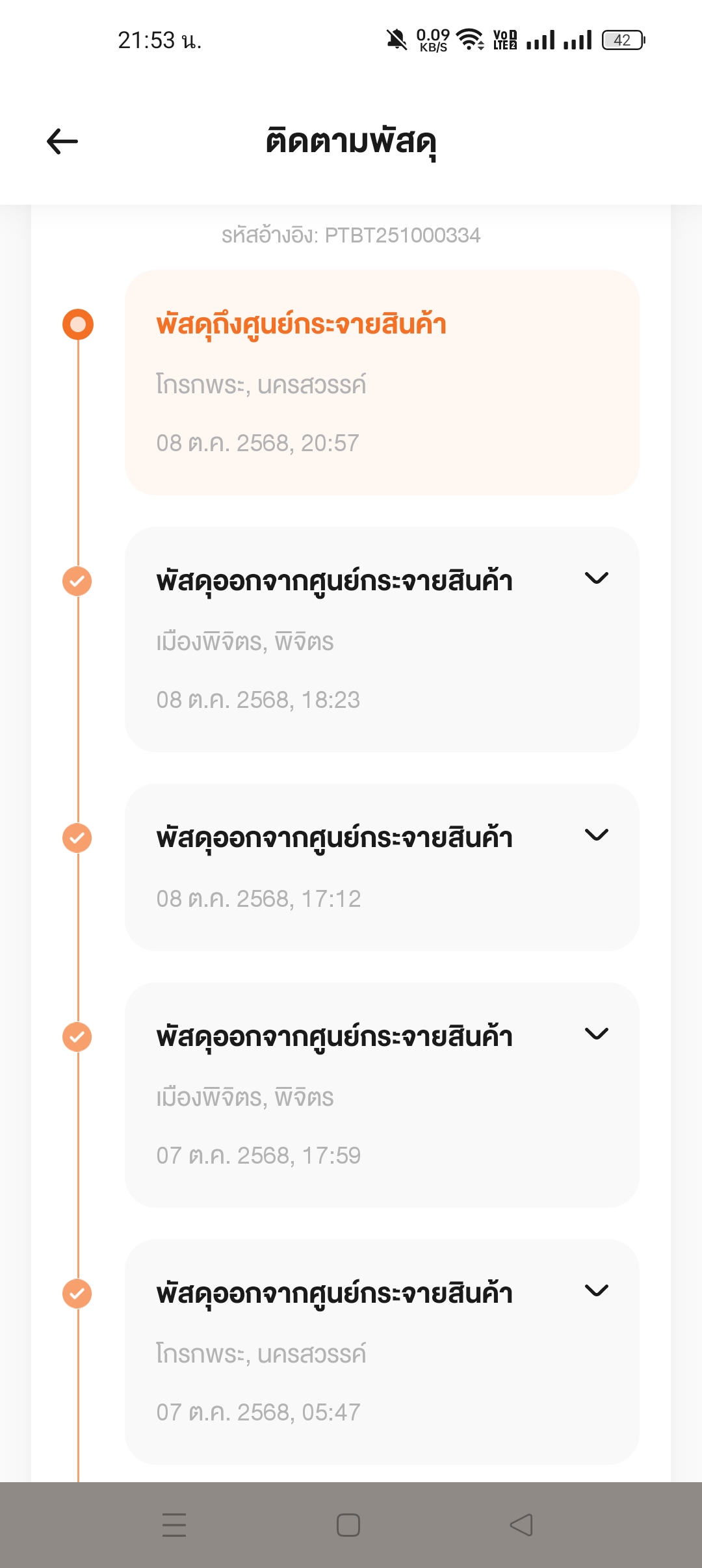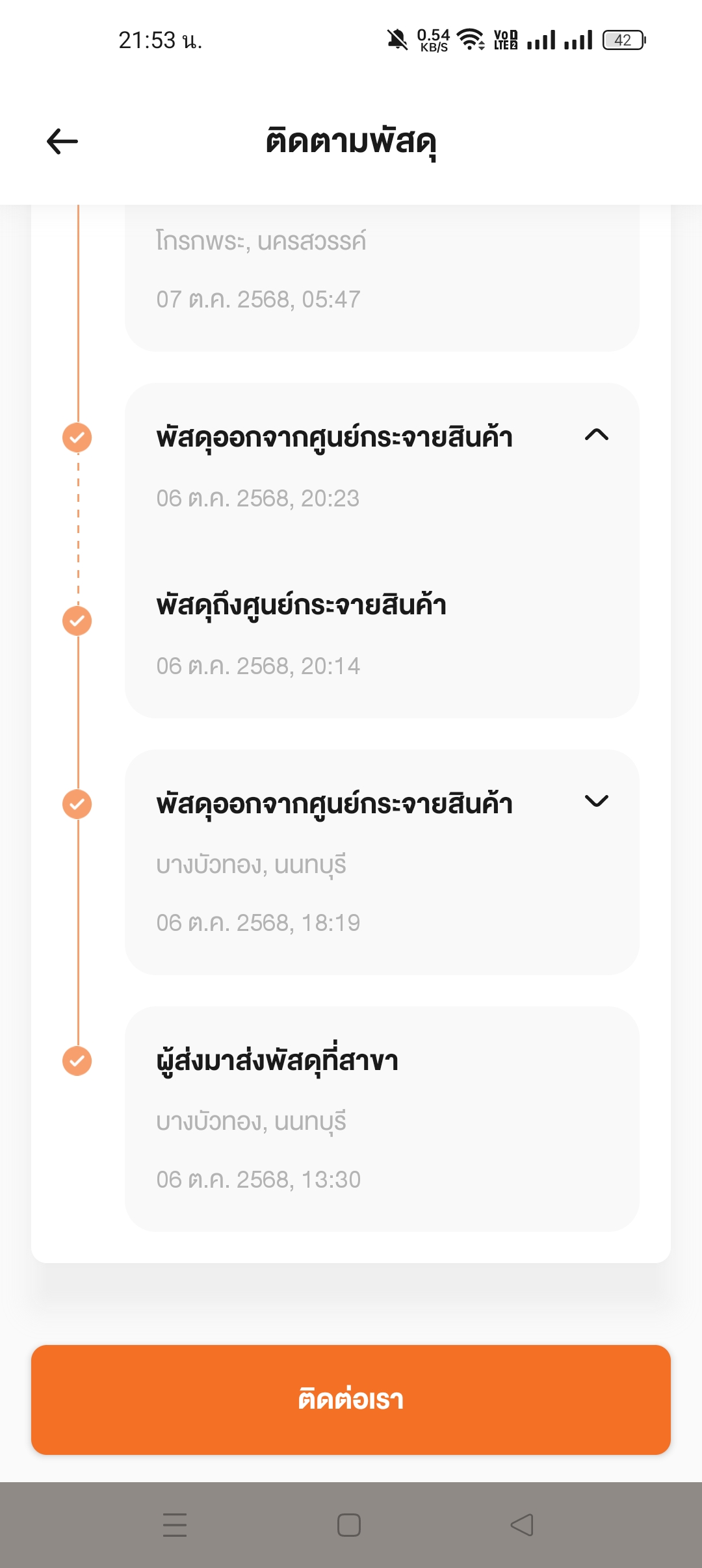 เราจัดส่งพัสดุให้ลูกค้าด้วยบริษัทสีส้มตั้งแต่วันที่ 28/9/68 เวลา 12.24น. พัสดุไปถึงศูนย์กระจายสินค้าตั้งแต่วันที่ 29/9/68 เวลา 08.20น. เป็นสถานะอัพเดทในระบบล่าสุดแค่นี้เลย หลังจากนั้นปลายทางลูกค้าแจ้ง