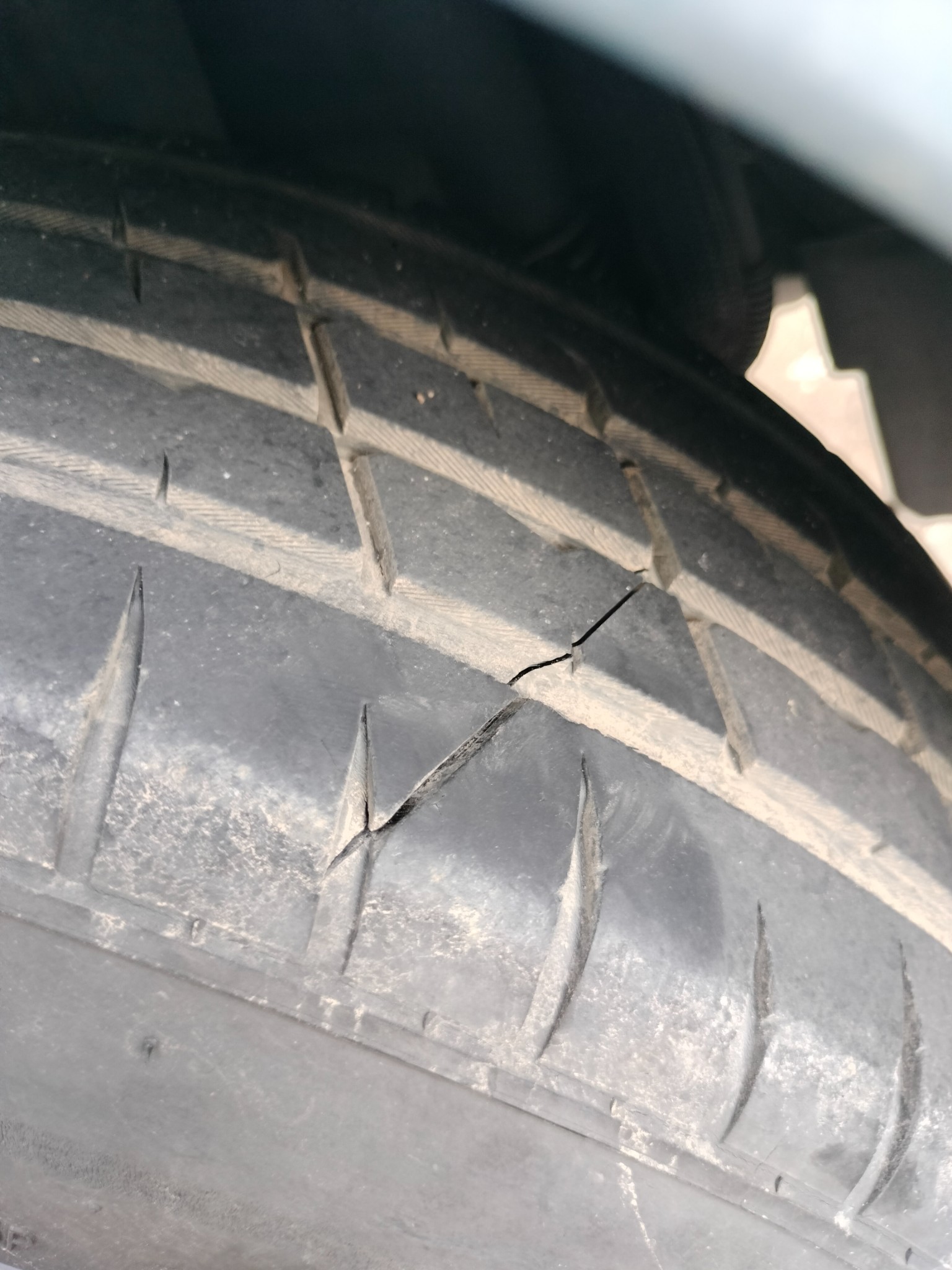 เพิ่งเห็นว่ายางรถยน์มีรอยเเตกเเบบนี้ไม่เเน่ใจว่าโดนอะไรเมื่อไหร สงสัยครับ 1.ควรเปลี่ยนยางใหม่ไหม 2.เป็นไปได้ว่าโดนกรีดไหม