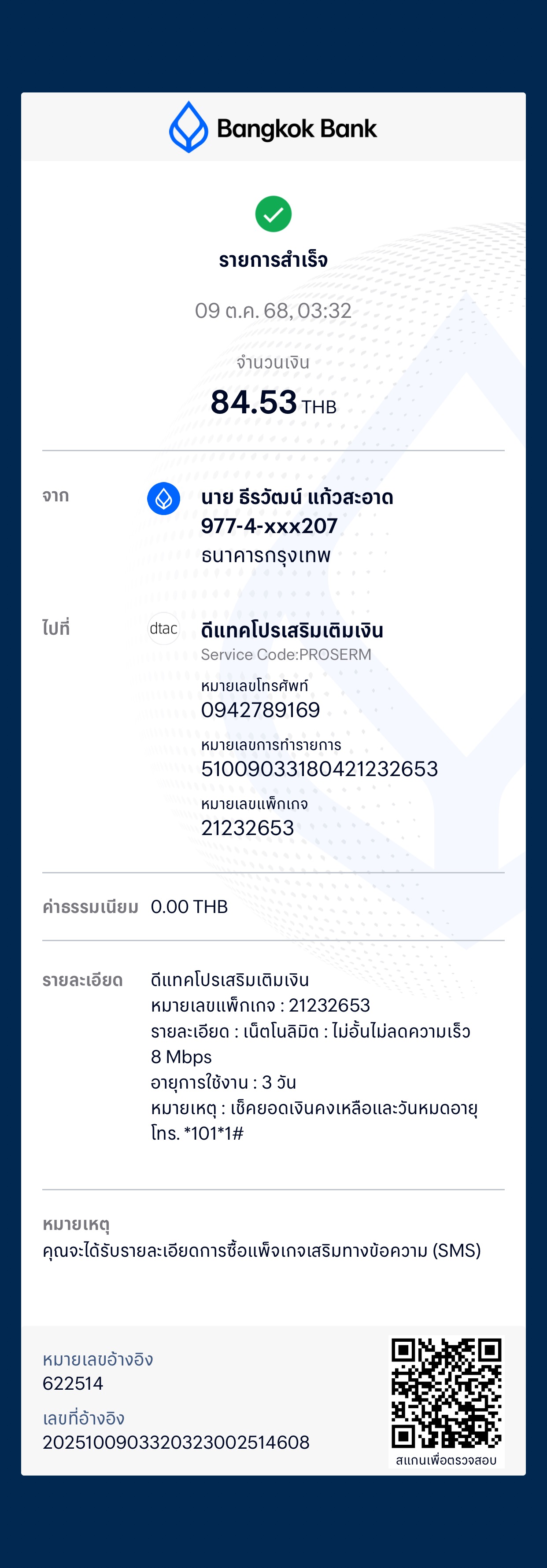เมื่อวันที่ 30 ก.ย.68 ช่วง19.29น ได้สมัครโปรเน็ตดีแทคไปในราคา 352.03บาท 30วัน 99GB รวมvat หักตัดเงินเรียบร้อย ใน บช ธนาคาร ทางเราก้คิดว่า สมัครแล้วได้เล่นเลย แต่ พึ่งมาเอ้ะใจว่าทำไม 10กว่าวัน เน็ตยังเ